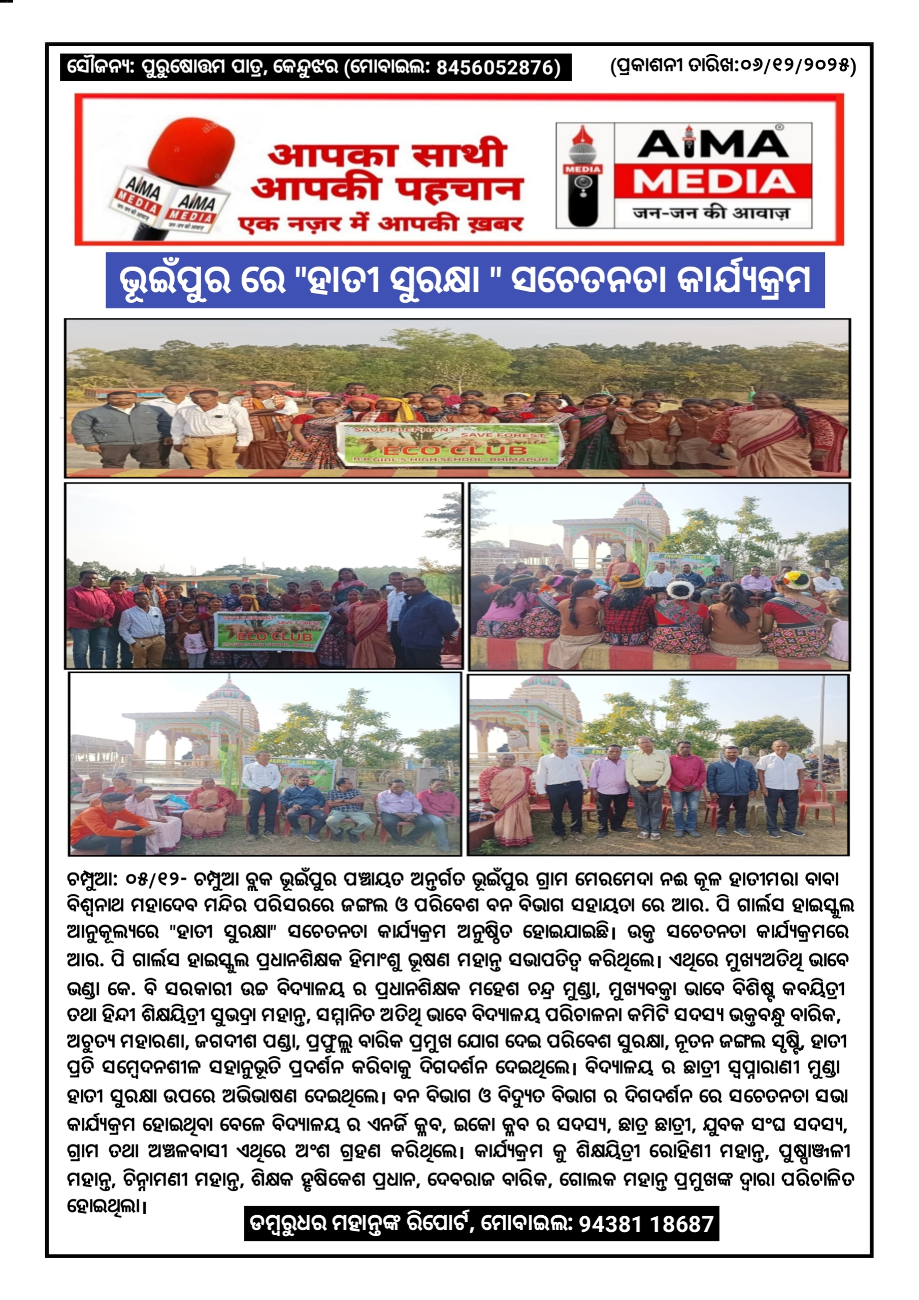 ଭୂଇଁପୁର ରେ "ହାତୀ ସୁରକ୍ଷା " ସଚେତନତା କାର୍ଯ୍ୟକ୍ରମ।