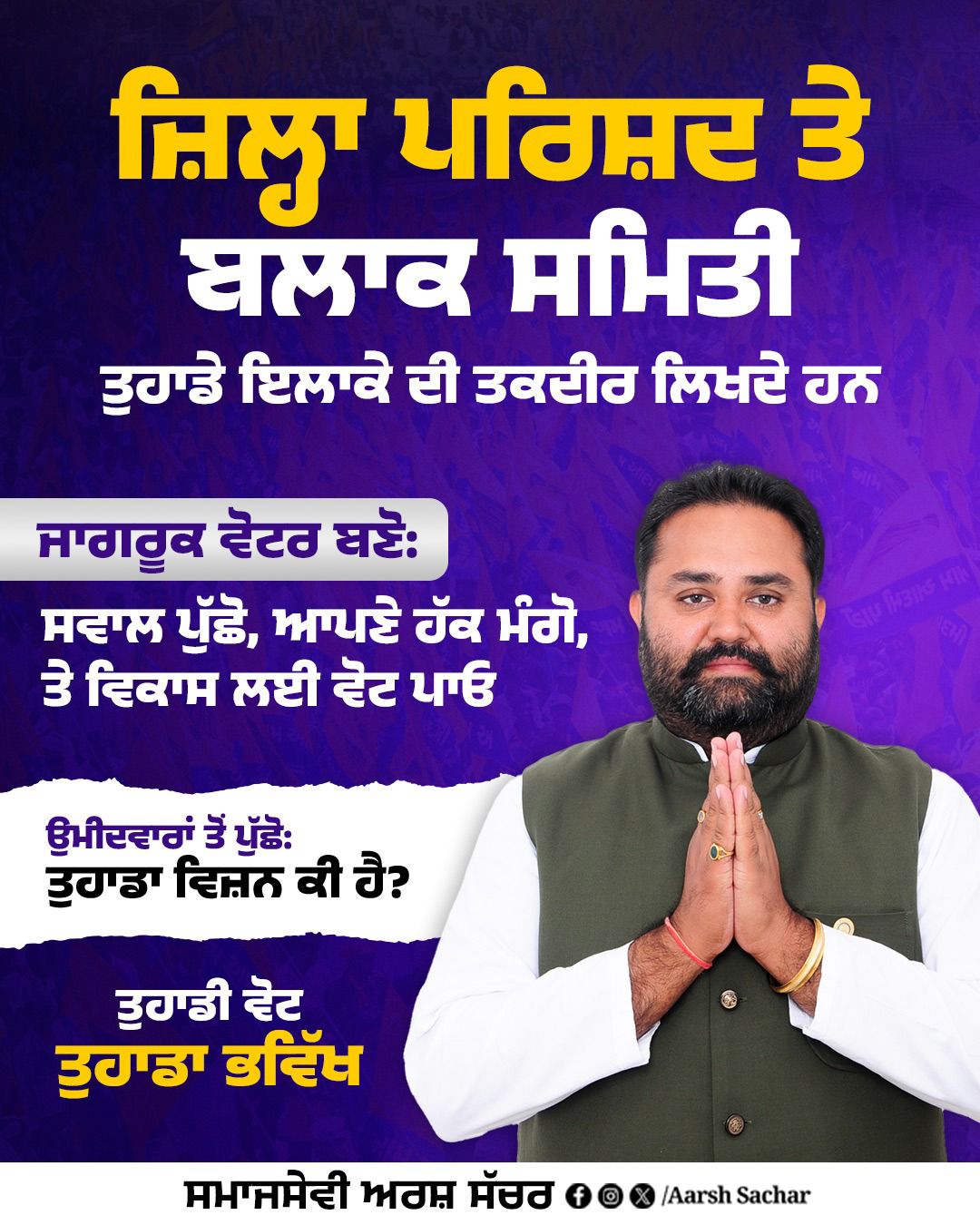 ਅਰਸ਼ ਸੱਚਰ ਵੱਲੋਂ ਜਨ-ਹਿਤ ਵਿੱਚ ਜਾਰੀ ਕੀਤੇ ਮਹੱਤਵਪੂਰਨ ਸੁਨੇਹੇ ਵਿੱਚ ਕਿਹਾ ਗਿਆ ਕਿ ਜ਼ਿਲ੍ਹਾ ਪਰਿਸ਼ਦ ਅਤੇ ਬਲਾਕ ਸਮਿਤੀਆਂ ਇਲਾਕੇ ਦੀਆਂ ਸਭ ਤੋਂ ਅਹਿਮ ਲੋਕਤੰਤਰਿਕ ਸੰਸਥਾਵਾਂ ਹਨ, ਜੋ ਸਿੱਧੇ ਤੌਰ ‘ਤੇ ਲੋਕਾਂ ਦੇ ਰੋਜ਼ਾਨਾ ਜੀਵਨ ਅਤੇ ਵਿਕਾਸ ਨਾਲ ਜੁੜੀਆਂ ਹਨ। ਓਹਨਾ ਨੇ ਦੱਸਿਆ ਕਿ ਇਹ ਸੰਸਥਾਵਾਂ ਸਿਰਫ਼ ਚੁਣੇ ਹੋਏ ਅਹੁਦੇ ਨਹੀਂ, ਸਗੋਂ ਜ਼ਿਲ੍ਹੇ ਦੀ ਤਕਦੀਰ ਲਿਖਣ ਵਾਲੇ ਕੇਂਦਰ ਹਨ।