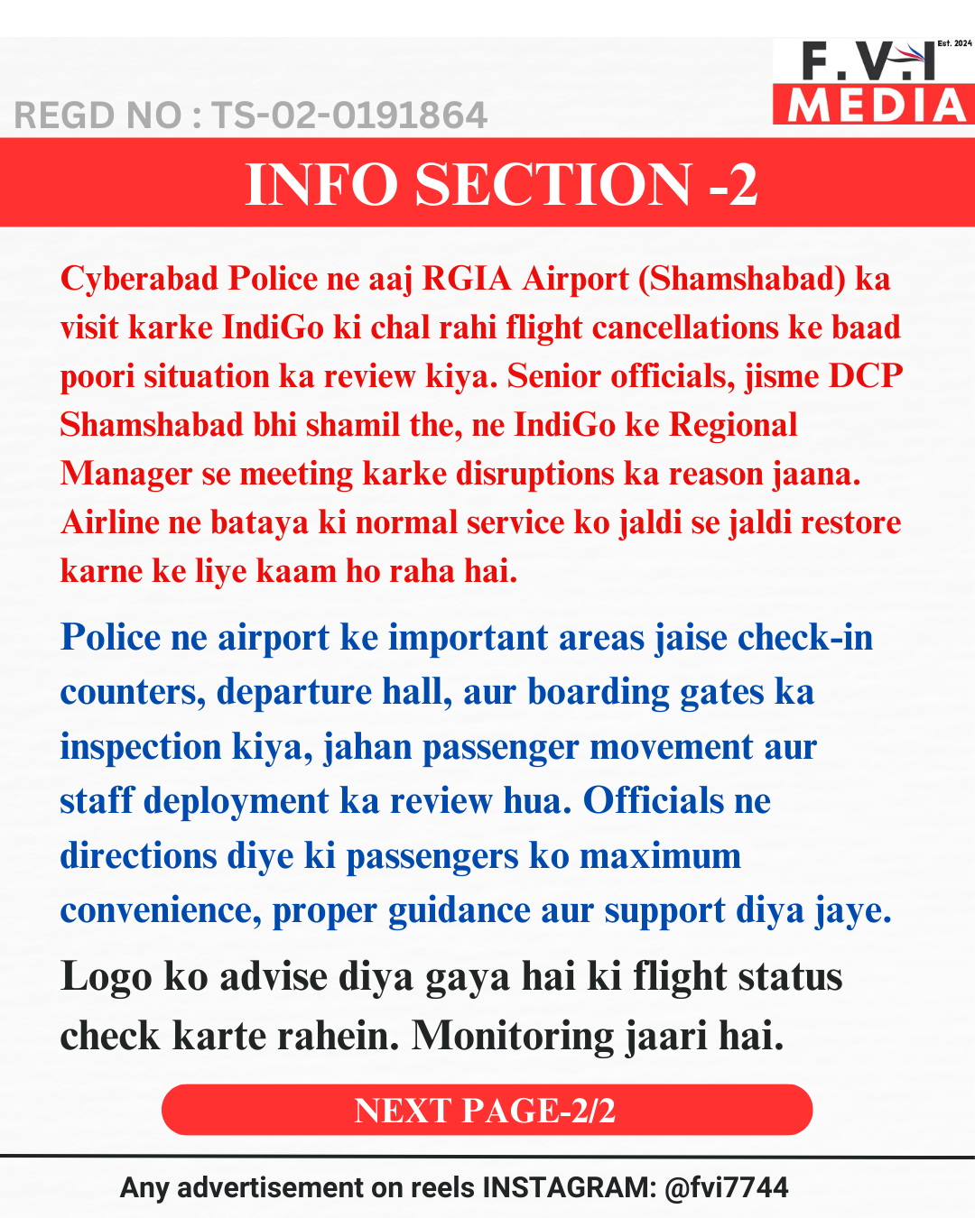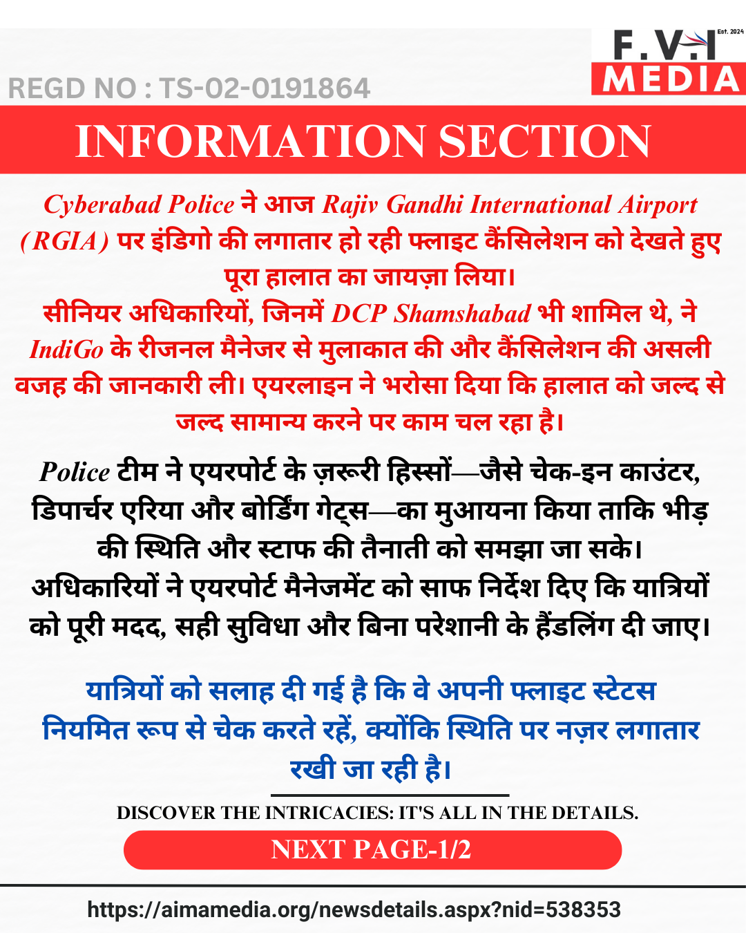Cyberabad Police conducted a detailed review at Rajiv Gandhi International Airport (RGIA) today following multiple IndiGo flight cancellations. Senior officials, including the DCP Shamshabad, met with the IndiGo Regional Manager to understand the cause of the disruptions. The airline assured that efforts are underway to restore normal operations as quickly as possible.