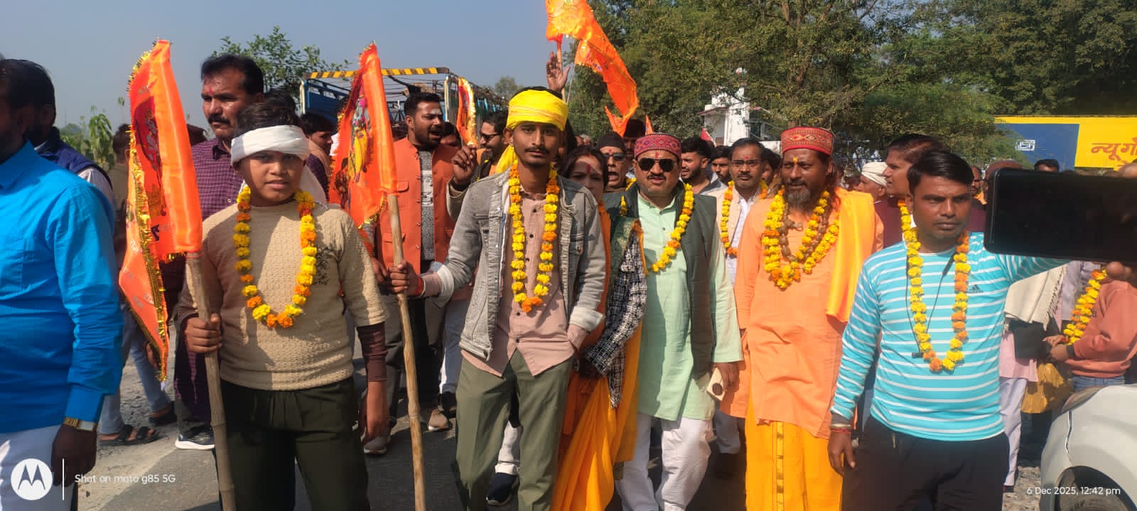 श्रृद्धा और भक्ति से ही ईश्वरीय कृपा की प्राप्ति होती है ईश्वर कृपा प्राप्ति और जीवन को सफल बनाने के लिए लोग तरह तरह की साधनाएं करते हैं कुछ भक्तों द्वारा प्रण लेकर पैदल यात्रा कर अपने आराध्य देव के दर्शन किए जाते है! इसी क्रम में गोहन थाना क्षेत्र के ग्राम गोहन स्थित रामजानकी मंदिर से आधा सैकड़ा से अधिक भक्तों ने डॉक्टर हनुमान के नाम से प्रसिद्ध ददरौआ धाम के लिए पैदल यात्रा प्रारम्भ की! ग्राम क्षेत्र से आए श्रद्धालुओं महिलाओं बच्चों ने भक्तों का हौसला बढ़ाया बस एक ही नाम जय श्री राम जय हनुमान के जयकारों से आकाश गुंजायमान हो उठा! ध्वज पताका के साथ बच्चों बुजुर्गो ने भी सहभागिता की! यह यात्रा ग्राम गोहन स्थित रामजानकी मंदिर से प्रारम्भ हुई जिसका विराम मध्य प्रदेश के ददरौआ धाम में होगा! इस यात्रा का प्रमुख उद्देश्य सनातनियो को नशा मुक्त रखना और जग की मंगल कामना है! यात्रा का प्रारंभ महंत रामजानकी मंदिर रामकिशोर पुरुषोत्तम दास महाराज शिवदयाल त्रिपाठी ने पूजन अर्चन के साथ किया! पैदल यात्रा में भक्तगण जयशंकर शुक्ला विनय तिवारी गौतम त्रिपाठी गुड्डन हवाई अननु महाराज सुरेंद्र संजय तिवारी विनोद त्रिपाठी विनोद चतुर्वेदी लालू शेखपुरा राम जी निखिल ब्रिजेश दम्मू विनय आतिश पंकज दुबे देवेंद्र द्विवेदी अमित तिवारी आदित्य शुक्ला अन्नू राजा विवेक ऋतिक दीपक महाराज मनोज दुबे सौरभ गोपी कुशवाह प्रमोद कुमार महेंद्र परिहार विवेक बैचेन सौरभ पांडेय नीलकमल भोला पाठक सहित सैकड़ों भक्तजन मौजूद रहे! सुरक्षा व्यवस्था में गोहन थाना अध्यक्ष सतीश कुमार एस आई अमर सिंह एस आई शिवबहादुर सहित हमराही फोर्स के साथ मुस्तैद रहे!