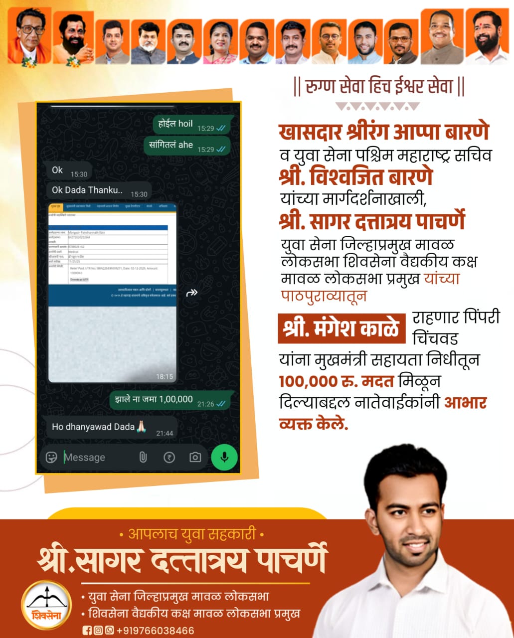 गॅलॅक्झी हॉस्पिटलमध्ये उपचार घेत असलेल्या मंगेश काळे (रा. पिंपरी–चिंचवड) यांना तातडीची आर्थिक मदत आवश्यक असल्याची माहिती मिळताच युवासेना जिल्हाप्रमुख सागर दत्तात्रय पाचर्णे यांनी त्वरित हालचाल केली.
