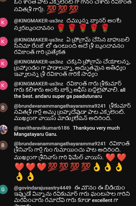 కార్యక్రమం ఆద్యంతం ఆసక్తిగా హుషారుగా, విసుగు విరామం లేకుండా చక్కగా సాగింది. ఇందులో శ్రీయుతులు రవికాంత్, శ్రీకుమార్, రవికుమార్, శ్రీనివాస్, భాస్కర్ ప్రభృతులు, శ్రీమతులు సీతాకుమారి, రమాదేవి, సవితశ్రీ ప్రభృతులు పాల్గొన్నారు. కార్యక్రమ నిర్వాహకులకు, గాయనీ గాయకులకు ప్రశంసల జల్లు కురిసింది.