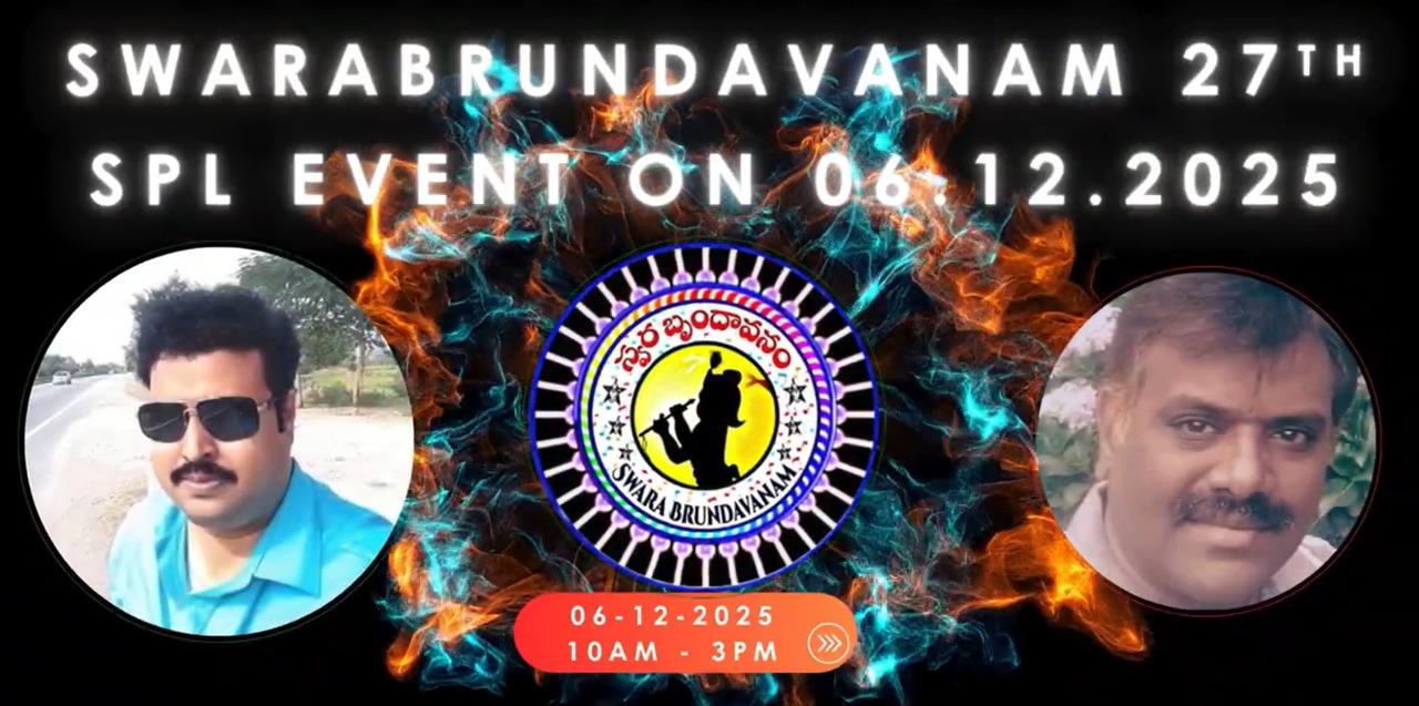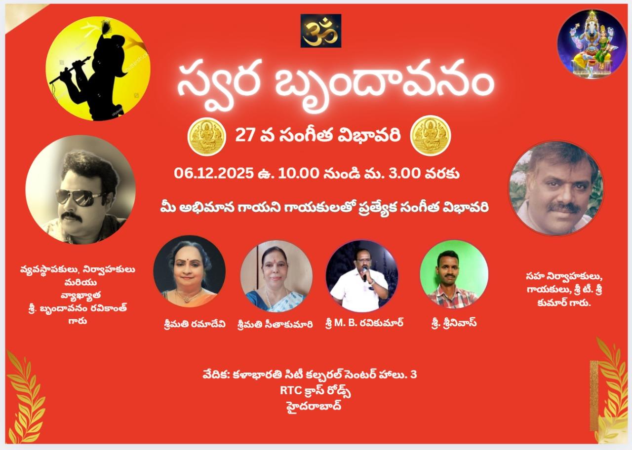 6.12.2025 తేదీన సిటీ కల్చరల్ స్టూడియో హైదరాబాదు నందు "మ్యాజిక్ బ్యానర్" "స్వర బృందావనం" 27 వ సినీ సంగీత విభావరి చాలా అద్భుతంగా, రసవత్తరంగా సాగి ప్రత్యక్ష పరోక్ష ప్రేక్షకుల నందరినీ అలరించింది. తక్కువమందితో చిన్నగా చేయాలనుకున్న ప్రోగ్రామ్ "స్వర బృందావనం" అభిమాన గాయనీ గాయకులు మరికొంతమంది చేరుటతో పెద్దదైనది.