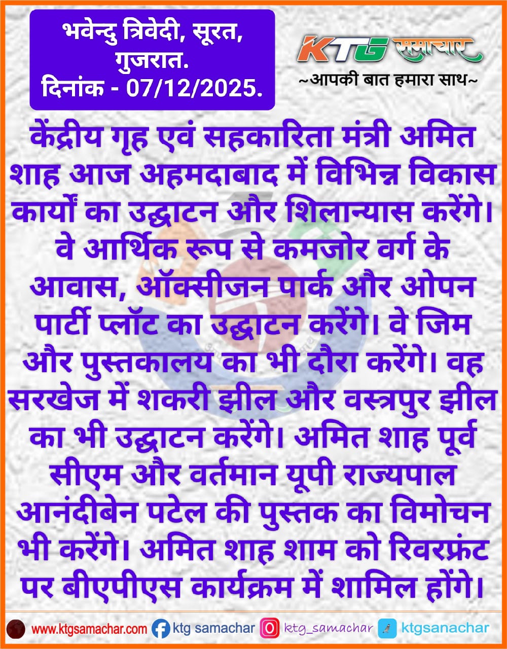केंद्रीय गृह एवं सहकारिता मंत्री अमित शाह आज अहमदाबाद में विभिन्न विकास कार्यों का उद्घाटन और शिलान्यास करेंगे।