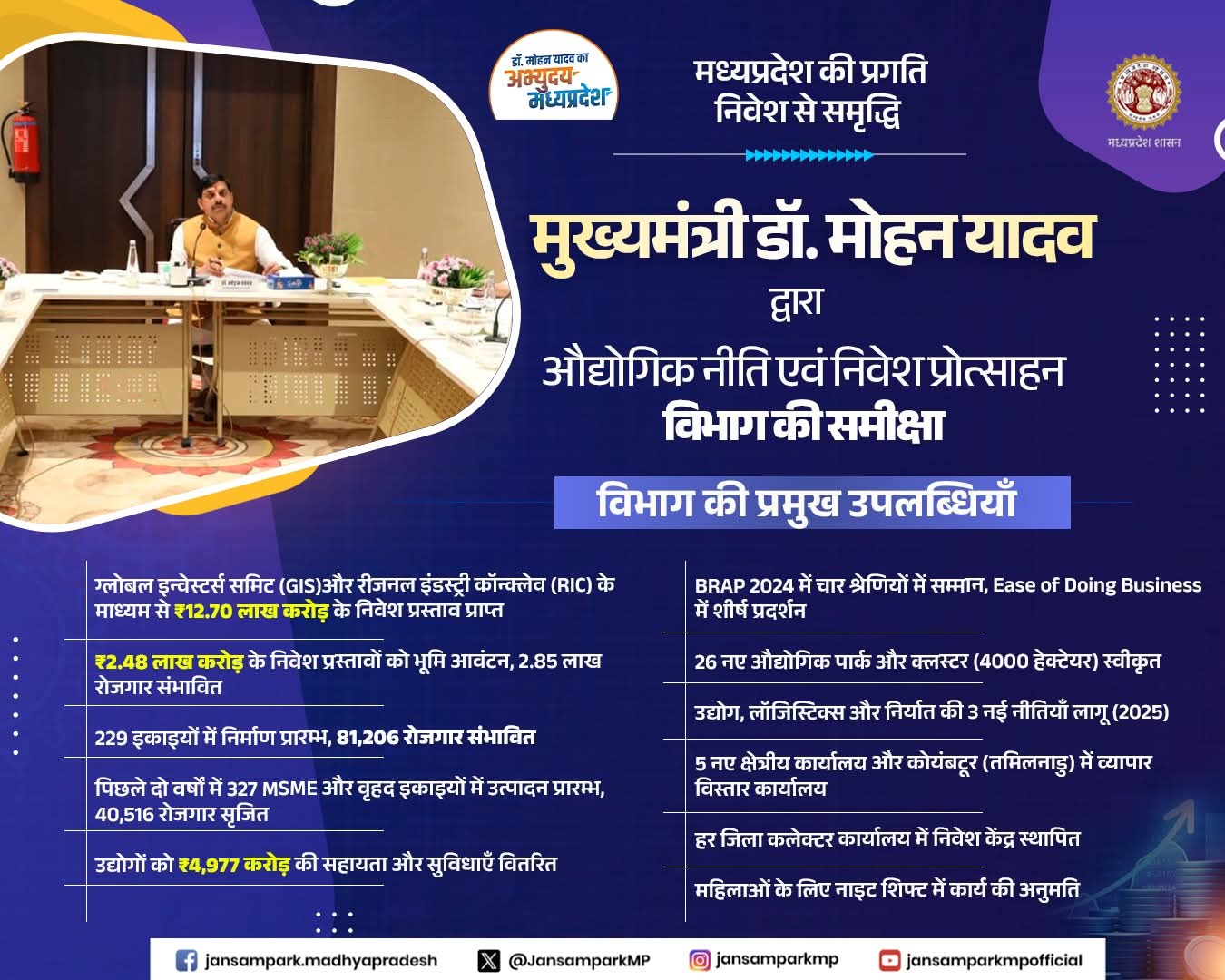 मुख्यमंत्री डॉ. मोहन यादव द्वारा खजुराहो में औद्योगिक नीति एवं निवेश प्रोत्साहन विभाग की समीक्षा