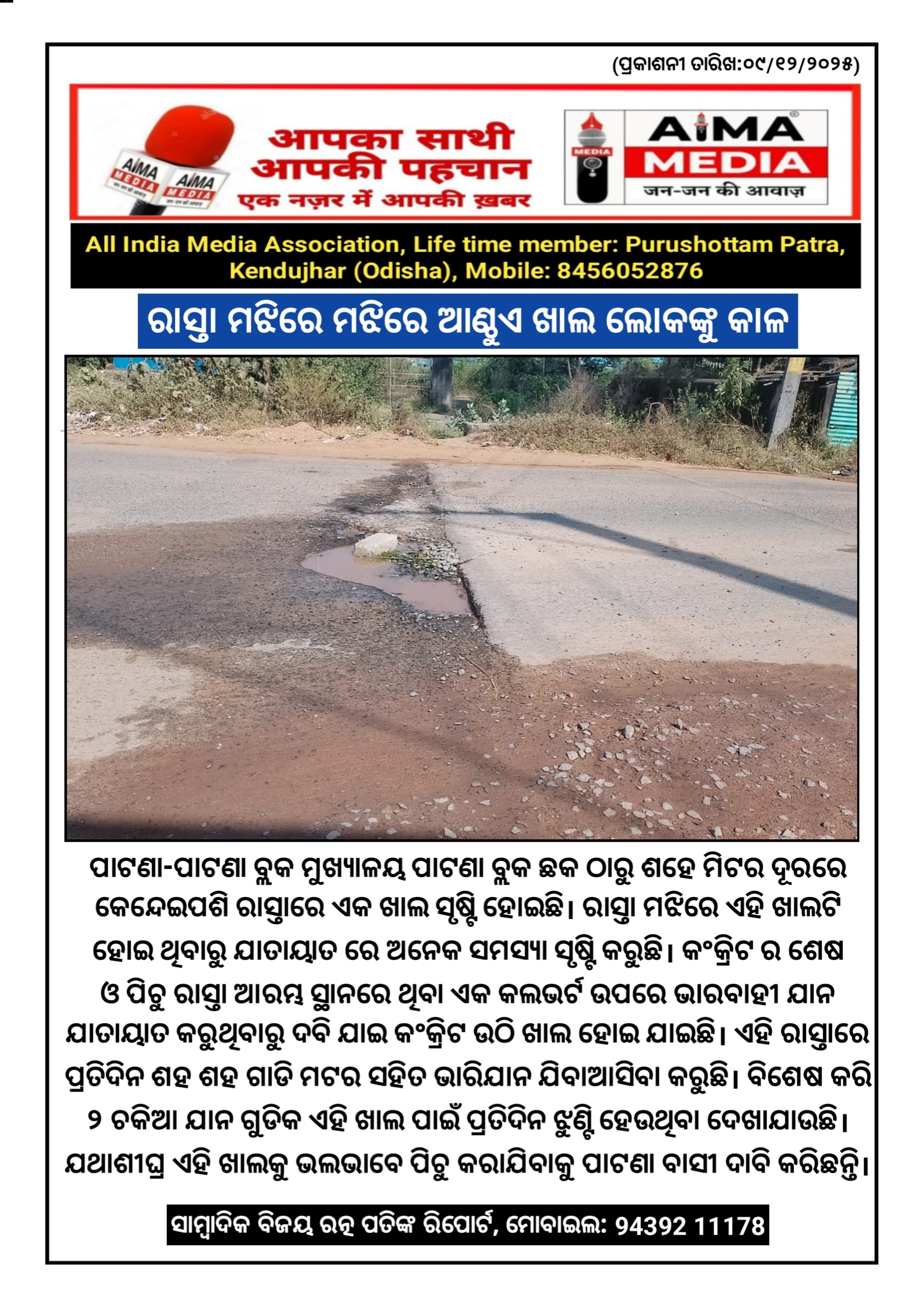 ପାଟଣା- ପାଟଣା ବ୍ଲକ ମୁଖ୍ୟାଳୟ ପାଟଣା ବ୍ଲକ ଛକ ଠାରୁ ଶହେ ମିଟର ଦୂରରେ କେନ୍ଦେଇପଶି ରାସ୍ତାରେ ଏକ ଖାଲ ସୃଷ୍ଟି ହୋଇଛି। ରାସ୍ତା ମଝିରେ ଏହି ଖାଲଟି ହୋଇ ଥିବାରୁ ଯାତାୟାତ ରେ ଅନେକ ସମସ୍ୟା ସୃଷ୍ଟି କରୁଛି। କଂକ୍ରିଟ ର ଶେଷ ଓ ପିଚୁ ରାସ୍ତା ଆରମ୍ଭ ସ୍ଥାନରେ ଥିବା ଏକ କଲଭର୍ଟ ଉପରେ ଭାରବାହୀ ଯାନ ଯାତାୟାତ କରୁଥିବାରୁ ଦବି ଯାଇ କଂକ୍ରିଟ ଉଠି ଖାଲ ହୋଇ ଯାଇଛି। ଏହି ରାସ୍ତାରେ ପ୍ରତିଦିନ ଶହ ଶହ ଗାଡି ମଟର ସହିତ ଭାରିଯାନ ଯିବାଆସିବା କରୁଛି। ବିଶେଷ କରି ୨ ଚକିଆ ଯାନ ଗୁଡିକ ଏହି ଖାଲ ପାଇଁ ପ୍ରତିଦିନ ଝୁଣ୍ଟି ହେଉଥିବା ଦେଖାଯାଉଛି। ଯଥାଶୀଘ୍ର ଏହି ଖାଲକୁ ଭଲଭାବେ ପିଚୁ କରାଯିବାକୁ ପାଟଣା ବାସୀ ଦାବି କରିଛନ୍ତି।