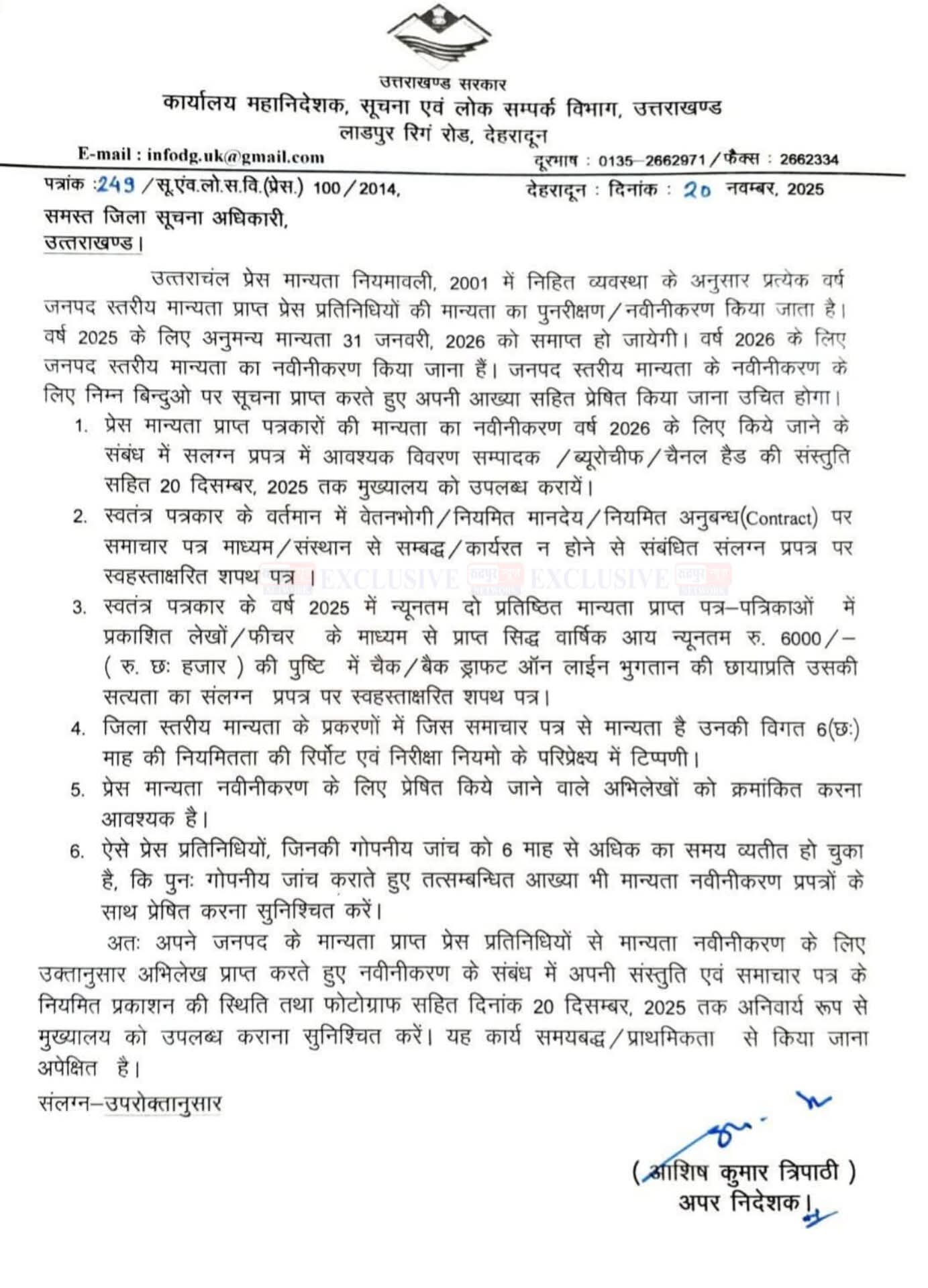 1. मान्यता प्राप्त पत्रकारों को सभी आवश्यक विवरण एवं संपादक/हाउस/चैनल हेड की सत्यापित सूची 20 दिसंबर 2025 तक जिला सूचना कार्यालय में उपलब्ध करानी होगी।