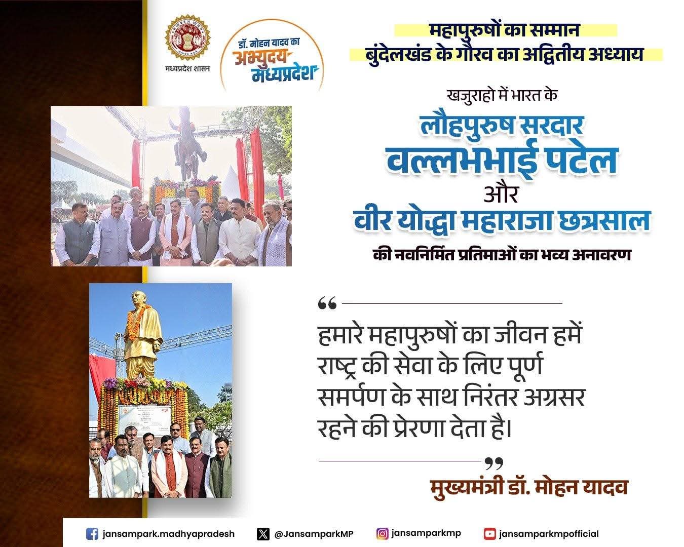 मुख्यमंत्री डॉ. मोहन यादव ने खजुराहो में भारत के लौहपुरुष सरदार वल्लभभाई पटेल जी और वीर योद्धा महाराजा छत्रसाल जी की नवनिर्मित प्रतिमाओं का भव्य अनावरण किया