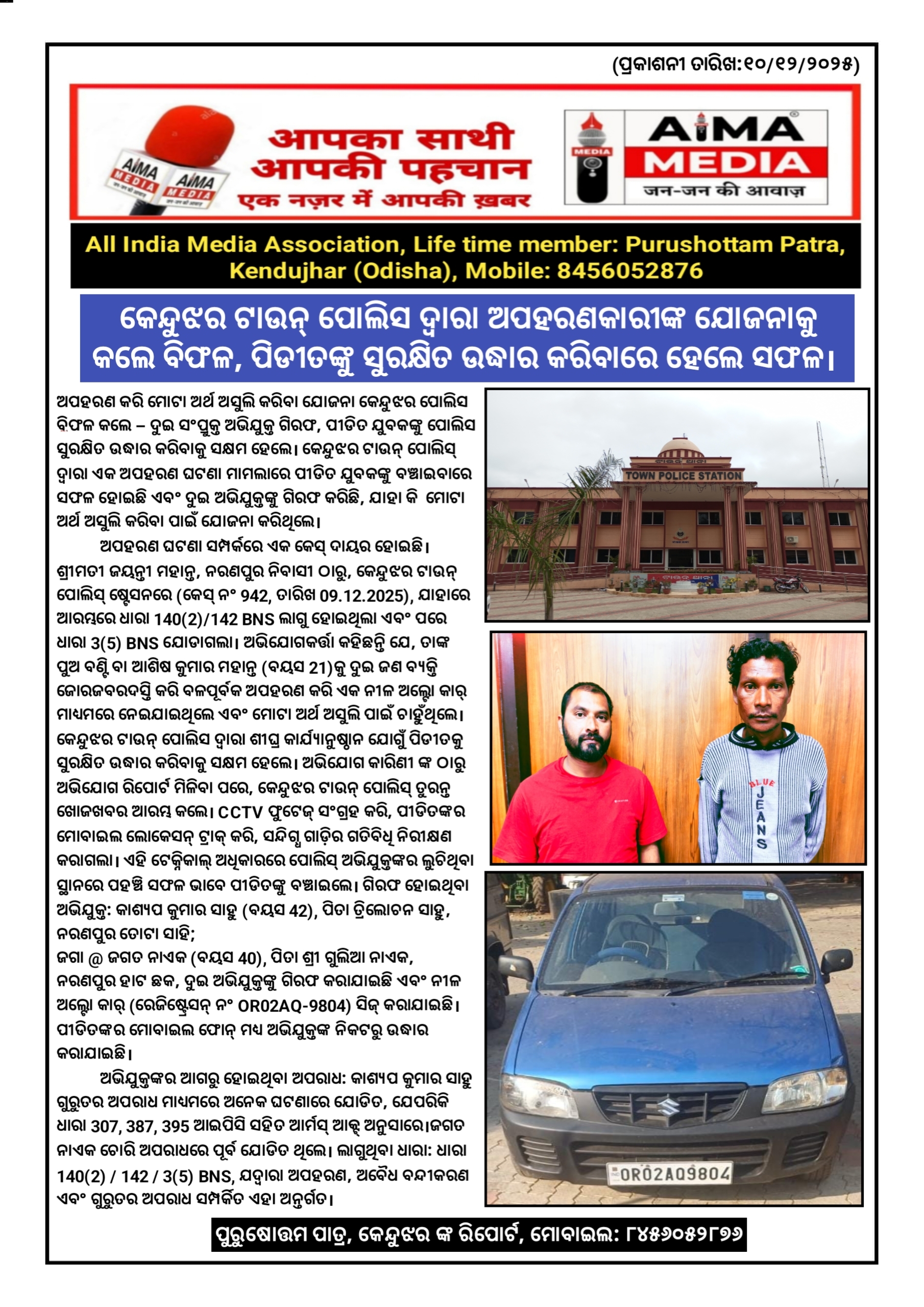 କେନ୍ଦୁଝର ଟାଉନ୍ ପୋଲିସ୍ ଦ୍ବାରା ଏକ ଅପହରଣ ଘଟଣା ମାମଲାରେ ପୀଡିତ ଯୁବକଙ୍କୁ ବଞ୍ଚାଇବାରେ ସଫଳ ହୋଇଛି ଏବଂ ଦୁଇ ଅଭିଯୁକ୍ତଙ୍କୁ ଗିରଫ କରିଛି, ଯାହା କି ମୋଟା ଅର୍ଥ ଅସୁଲି କରିବା ପାଇଁ ଯୋଜନା କରିଥିଲେ। ଅପହରଣ ଘଟଣା ସମ୍ପର୍କରେ ଏକ କେସ୍ ଦାୟରି ହୋଇଛି। ଶ୍ରୀମତୀ ଜୟନ୍ତୀ ମହାନ୍ତ, ନରଣପୁର ନିବାସୀ ଠାରୁ, କେନ୍ଦୁଝର ଟାଉନ୍ ପୋଲିସ୍ ଷ୍ଟେସନରେ (କେସ୍ ନଂ 942, ତାରିଖ 09.12.2025), ଯାହାରେ ଆରମ୍ଭରେ ଧାରା 140(2)/142 BNS ଲାଗୁ ହୋଇଥିଲା ଏବଂ ପରେ ଧାରା 3(5) BNS ଯୋଡାଗଲା। ଅଭିଯୋଗକର୍ତ୍ତା କହିଛନ୍ତି ଯେ, ତାଙ୍କ ପୁଅ ବଣ୍ଟି ବା ଆଶିଷ କୁମାର ମହାନ୍ତ (ବୟସ 21)କୁ ଦୁଇ ଜଣ ବ୍ୟକ୍ତି ଜୋରଜବରଦସ୍ତି କରି ବଳପୂର୍ବକ ଅପହରଣ କରି ଏକ ନୀଳ ଅଲ୍ଟୋ କାର୍ ମାଧ୍ୟମରେ ନେଇଯାଇଥିଲେ ଏବଂ ମୋଟା ଅର୍ଥ ଅସୁଲି ପାଇଁ ଚାହୁଁଥିଲେ। କେନ୍ଦୁଝର ଟାଉନ୍ ପୋଲିସ ଦ୍ବାରା ଶୀଘ୍ର କାର୍ଯ୍ୟାନୁଷ୍ଠାନ ଯୋଗୁଁ ପିଡୀତକୁ ସୁରକ୍ଷିତ ଉଦ୍ଧାର କରିବାକୁ ସକ୍ଷମ ହେଲେ। ଅଭିଯୋଗ କାରିଣୀ ଙ୍କ ଠାରୁ ଅଭିଯୋଗ ରିପୋର୍ଟ ମିଳିବା ପରେ, କେନ୍ଦୁଝର ଟାଉନ୍ ପୋଲିସ୍ ତୁରନ୍ତ ଖୋଜଖବର ଆରମ୍ଭ କଲେ। CCTV ଫୁଟେଜ୍ ସଂଗ୍ରହ କରି, ପୀଡିତଙ୍କର ମୋବାଇଲ ଲୋକେସନ୍ ଟ୍ରାକ୍ କରି, ସନ୍ଦିଗ୍ଧ ଗାଡ଼ିର ଗତିବିଧି ନିରୀକ୍ଷଣ କରାଗଲା। ଏହି ଟେକ୍ନିକାଲ୍ ଅଧିକାରରେ ପୋଲିସ୍ ଅଭିଯୁକ୍ତଙ୍କର ଲୁଚିଥିବା ସ୍ଥାନରେ ପହଞ୍ଚି ସଫଳ ଭାବେ ପୀଡିତଙ୍କୁ ବଞ୍ଚାଇଲେ। ଗିରଫ ହୋଇଥିବା ଅଭିଯୁକ୍ତ: କାଶ୍ୟପ କୁମାର ସାହୁ (ବୟସ 42), ପିତା ତ୍ରିଲୋଚନ ସାହୁ, ନରଣପୁର ତୋଟା ସାହି;