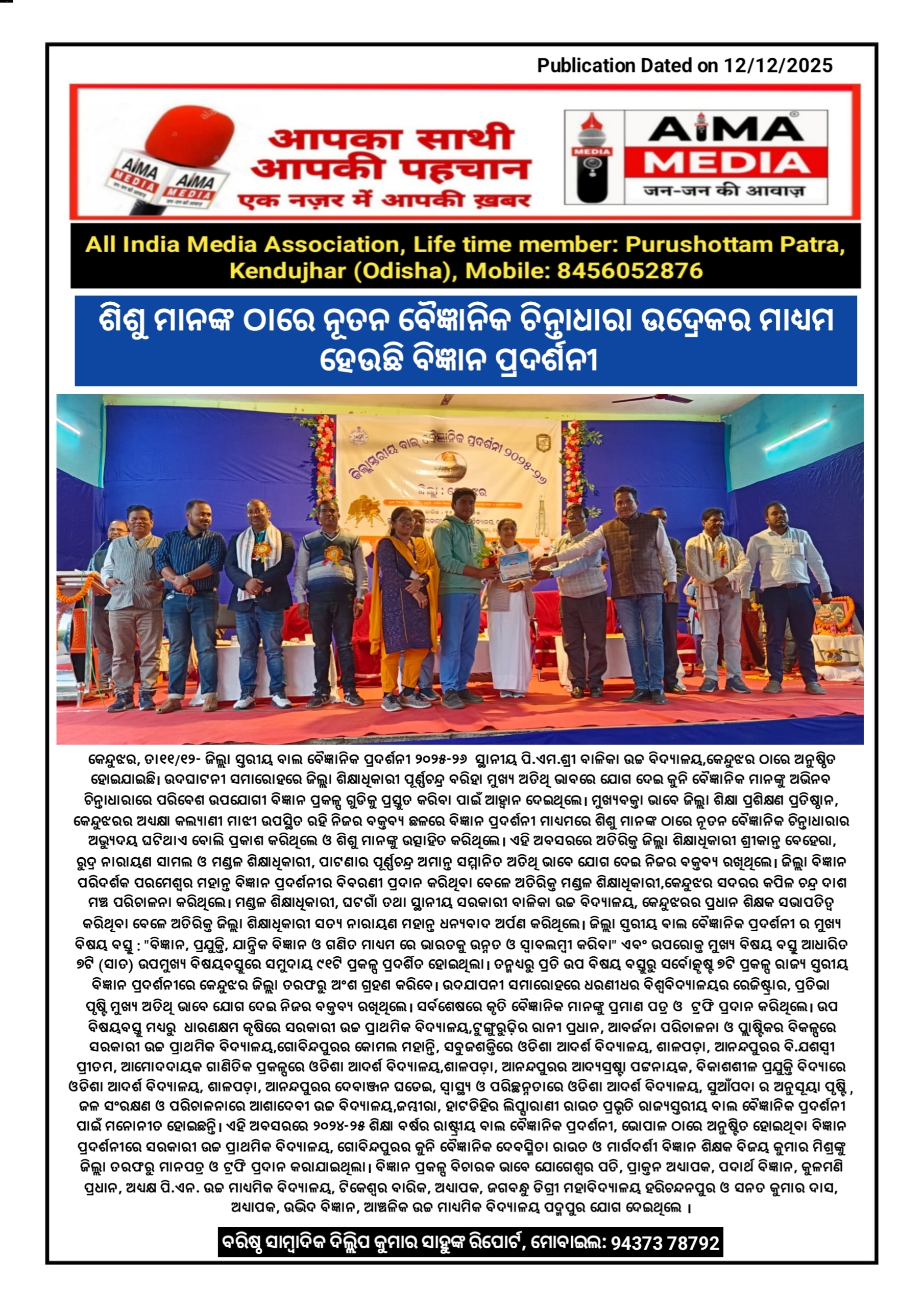 କେନ୍ଦୁଝର,ତା୧୧/୧୨- ଜିଲ୍ଲା ସ୍ତରୀୟ ବାଲ ବୈଜ୍ଞାନିକ ପ୍ରଦର୍ଶନୀ ୨୦୨୫-୨୬ ସ୍ଥାନୀୟ ପି.ଏମ.ଶ୍ରୀ ବାଳିକା ଉଚ୍ଚ ବିଦ୍ୟାଳୟ,କେନ୍ଦୁଝର ଠାରେ ଅନୁଷ୍ଠିତ ହୋଇଯାଇଛି l ଉଦଘାଟନୀ ସମାରୋହରେ ଜିଲ୍ଲା ଶିକ୍ଷାଧିକାରୀ ପୂର୍ଣ୍ଣଚନ୍ଦ୍ର ବରିହା ମୁଖ୍ୟ ଅତିଥି ଭାବରେ ଯୋଗ ଦେଇ କୁନି ବୈଜ୍ଞାନିକ ମାନଙ୍କୁ ଅଭିନବ ଚିନ୍ତାଧାରାରେ ପରିବେଶ ଉପଯୋଗୀ ବିଜ୍ଞାନ ପ୍ରକଳ୍ପ ଗୁଡିକୁ ପ୍ରସ୍ତୁତ କରିବା ପାଇଁ ଆହ୍ବାନ ଦେଇଥିଲେ । ମୁଖ୍ୟବକ୍ତା ଭାବେ ଜିଲ୍ଲା ଶିକ୍ଷା ପ୍ରଶିକ୍ଷଣ ପ୍ରତିଷ୍ଠାନ,କେନ୍ଦୁଝରର ଅଧ୍ୟକ୍ଷା କଲ୍ୟାଣୀ ମାଝୀ ଉପସ୍ଥିତ ରହି ନିଜର ବକ୍ତବ୍ୟ ଛଳରେ ବିଜ୍ଞାନ ପ୍ରଦର୍ଶନୀ ମାଧ୍ୟମରେ ଶିଶୁ ମାନଙ୍କ ଠାରେ ନୂତନ ବୈଜ୍ଞାନିକ ଚିନ୍ତାଧାରାର ଅଭ୍ୟୁଦୟ ଘଟିଥାଏ ବୋଲି ପ୍ରକାଶ କରିଥିଲେ ଓ ଶିଶୁ ମାନଙ୍କୁ ଉତ୍ସାହିତ କରିଥିଲେ । ଏହି ଅବସରରେ ଅତିରିକ୍ତ ଜିଲ୍ଲା ଶିକ୍ଷାଧିକାରୀ ଶ୍ରୀକାନ୍ତ ବେହେରା, ରୁଦ୍ର ନାରାୟଣ ସାମଲ ଓ ମଣ୍ଡଳ ଶିକ୍ଷାଧିକାରୀ,ପାଟଣାର ପୂର୍ଣ୍ଣଚନ୍ଦ୍ର ଅମାନ୍ତ ସମ୍ମାନିତ ଅତିଥି ଭାବେ ଯୋଗ ଦେଇ ନିଜର ବକ୍ତବ୍ୟ ରଖିଥିଲେ l ଜିଲ୍ଲା ବିଜ୍ଞାନ ପରିଦର୍ଶକ ପରମେଶ୍ବର ମହାନ୍ତ ବିଜ୍ଞାନ ପ୍ରଦର୍ଶନୀର ବିବରଣୀ ପ୍ରଦାନ କରିଥିବା ବେଳେ ଅତିରିକ୍ତ ମଣ୍ଡଳ ଶିକ୍ଷାଧିକାରୀ,କେନ୍ଦୁଝର ସଦରର କପିଳ ଚନ୍ଦ୍ର ଦାଶ ମଞ୍ଚ ପରିଚାଳନା କରିଥିଲେ l ମଣ୍ଡଳ ଶିକ୍ଷାଧିକାରୀ,ଘଟଗାଁ ତଥା ସ୍ଥାନୀୟ ସରକାରୀ ବାଳିକା ଉଚ୍ଚ ବିଦ୍ୟାଳୟ, କେନ୍ଦୁଝରର ପ୍ରଧାନ ଶିକ୍ଷକ ସଭାପତିତ୍ବ କରିଥିବା ବେଳେ ଅତିରିକ୍ତ ଜିଲ୍ଲା ଶିକ୍ଷାଧିକାରୀ ସତ୍ୟ ନାରାୟଣ ମହାନ୍ତ ଧନ୍ୟବାଦ ଅର୍ପଣ କରିଥିଲେ। ଜିଲ୍ଲା ସ୍ତରୀୟ ଵାଲ ବୈଜ୍ଞାନିକ ପ୍ରଦର୍ଶନୀ ର ମୁଖ୍ୟ ବିଷୟ ବସ୍ତୁ : "ବିଜ୍ଞାନ,ପ୍ରଯୁକ୍ତି,ଯାନ୍ତ୍ରିକ ବିଜ୍ଞାନ ଓ ଗଣିତ ମାଧ୍ୟମ ରେ ଭାରତକୁ ଉନ୍ନତ ଓ ସ୍ୱାବଲମ୍ବୀ କରିବା" ଏବଂ ଉପରୋକ୍ତ ମୁଖ୍ୟ ବିଷୟ ବସ୍ତୁ ଆଧାରିତ ୭ଟି (ସାତ ) ଉପମୁଖ୍ୟ ବିଷୟବସ୍ତୁରେ ସମୁଦାୟ ୯୧ଟି ପ୍ରକଳ୍ପ ପ୍ରଦର୍ଶିତ ହୋଇଥିଲା । ତନ୍ମଧ୍ୟରୁ ପ୍ରତି ଉପ ବିଷୟ ବସ୍ତୁରୁ ସର୍ବୋତ୍କୃଷ୍ଟ ୭ଟି ପ୍ରକଳ୍ପ ରାଜ୍ୟ ସ୍ତରୀୟ ବିଜ୍ଞାନ ପ୍ରଦର୍ଶନୀରେ କେନ୍ଦୁଝର ଜିଲ୍ଲା ତରଫରୁ ଅଂଶ ଗ୍ରହଣ କରିବେ। ଉଦଯାପନୀ ସମାରୋହରେ ଧରଣୀଧର ବିଶ୍ବବିଦ୍ୟାଳୟର ରେଜିଷ୍ଟ୍ରାର,ପ୍ରତିଭା ପୃଷ୍ଟି ମୁଖ୍ୟ ଅତିଥି ଭାବେ ଯୋଗ ଦେଇ ନିଜର ବକ୍ତବ୍ୟ ରଖିଥିଲେ। ସର୍ବଶେଷରେ କୃତି ବୈଜ୍ଞାନିକ ମାନଙ୍କୁ ପ୍ରମାଣ ପତ୍ର ଓ ଟ୍ରଫି ପ୍ରଦାନ କରିଥିଲେ । ଉପ ବିଷୟବସ୍ତୁ ମଧ୍ୟରୁ ଧାରଣକ୍ଷମ କୃଷିରେ ସରକାରୀ ଉଚ୍ଚ ପ୍ରାଥମିକ ବିଦ୍ୟାଳୟ,ଟୁଙ୍ଗୁରୁଢ଼ିର ରାନୀ ପ୍ରଧାନ,ଆବର୍ଜନା ପରିଚାଳନା ଓ ପ୍ଲାଷ୍ଟିକର ବିକଳ୍ପରେ ସରକାରୀ ଉଚ୍ଚ ପ୍ରାଥମିକ ବିଦ୍ୟାଳୟ,ଗୋବିନ୍ଦପୁରର କୋମଲ ମହାନ୍ତି, ସବୁଜଶକ୍ତିରେ ଓଡିଶା ଆଦର୍ଶ ବିଦ୍ୟାଳୟ, ଶାଳପଡ଼ା, ଆନନ୍ଦପୁରର ବି.ଯଶସ୍ଵୀ ପ୍ରୀତମ, ଆମୋଦଦାୟକ ଗାଣିତିକ ପ୍ରକଳ୍ପରେ ଓଡିଶା ଆଦର୍ଶ ବିଦ୍ୟାଳୟ,ଶାଳପଡ଼ା, ଆନନ୍ଦପୁରର ଆଦ୍ୟସ୍ରଷ୍ଟା ପଟ୍ଟନାୟକ,ବିକାଶଶୀଳ ପ୍ରଯୁକ୍ତି ବିଦ୍ୟାରେ ଓଡିଶା ଆଦର୍ଶ ବିଦ୍ୟାଳୟ, ଶାଳପଡ଼ା, ଆନନ୍ଦପୁରର ଦେବାଞ୍ଜନ ଘଡେଇ, ସ୍ୱାସ୍ଥ୍ୟ ଓ ପରିଚ୍ଛନ୍ନତାରେ ଓଡିଶା ଆଦର୍ଶ ବିଦ୍ୟାଳୟ, ସୁଆଁପଦା ର ଅନୁସୂୟା ପୃଷ୍ଟି , ଜଳ ସଂରକ୍ଷଣ ଓ ପରିଚାଳନାରେ ଆଶାଦେବୀ ଉ