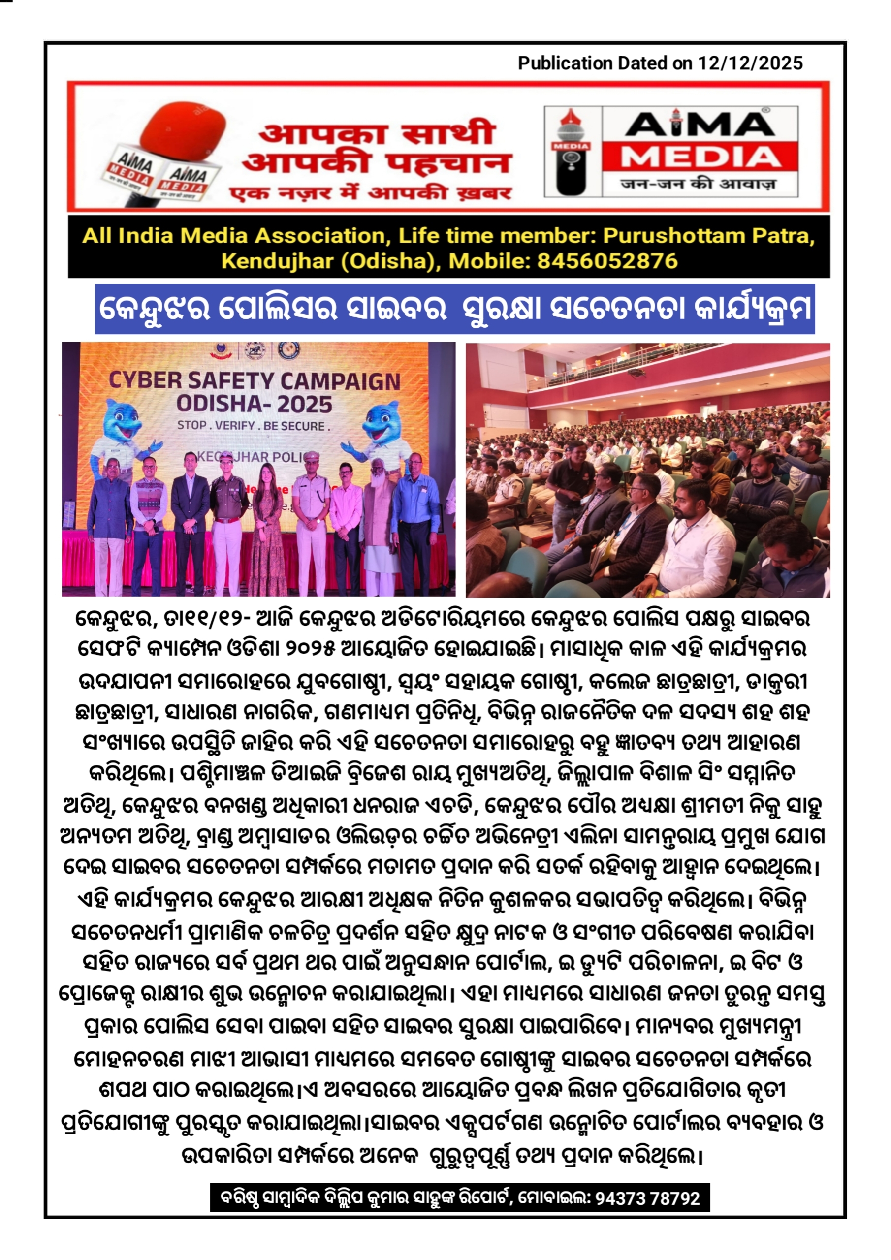 କେନ୍ଦୁଝର, ତା୧୧/୧୨- ଆଜି କେନ୍ଦୁଝର ଅଡିଟୋରିୟମରେ କେନ୍ଦୁଝର ପୋଲିସ ପକ୍ଷରୁ ସାଇବର ସେଫଟି କ୍ୟାମ୍ପେନ ଓଡିଶା ୨୦୨୫ ଆୟୋଜିତ ହୋଇଯାଇଛି। ମାସାଧିକ କାଳ ଏହି କାର୍ଯ୍ୟକ୍ରମର ଉଦଯାପନୀ ସମାରୋହରେ ଯୁବଗୋଷ୍ଠୀ, ସ୍ୱୟଂ ସହାୟକ ଗୋଷ୍ଠୀ, କଲେଜ ଛାତ୍ରଛାତ୍ରୀ, ଡାକ୍ତରୀ ଛାତ୍ରଛାତ୍ରୀ, ସାଧାରଣ ନାଗରିକ, ଗଣମାଧ୍ୟମ ପ୍ରତିନିଧି, ବିଭିନ୍ନ ରାଜନୈତିକ ଦଳ ସଦସ୍ୟ ଶହ ଶହ ସଂଖ୍ୟାରେ ଉପସ୍ଥିତି ଜାହିର କରି ଏହି ସଚେତନତା ସମାରୋହରୁ ବହୁ ଜ୍ଞାତବ୍ୟ ତଥ୍ୟ ଆହାରଣ କରିଥିଲେ। ପଶ୍ଚିମାଞ୍ଚଳ ଡିଆଇଜି ବ୍ରିଜେଶ ରାୟ ମୁଖ୍ୟଅତିଥି, ଜିଲ୍ଲାପାଳ ବିଶାଳ ସିଂ ସମ୍ମାନିତ ଅତିଥି, କେନ୍ଦୁଝର ବନଖଣ୍ଡ ଅଧିକାରୀ ଧନରାଜ ଏଚଡି, କେନ୍ଦୁଝର ପୌର ଅଧ୍ୟକ୍ଷା ଶ୍ରୀମତୀ ନିକୁ ସାହୁ ଅନ୍ୟତମ ଅତିଥି, ବ୍ରାଣ୍ଡ ଅମ୍ବାସାଡର ଓଲିଉଡ଼ର ଚର୍ଚ୍ଚିତ ଅଭିନେତ୍ରୀ ଏଲିନା ସାମନ୍ତରାୟ ପ୍ରମୁଖ ଯୋଗ ଦେଇ ସାଇବର ସଚେତନତା ସମ୍ପର୍କରେ ମତାମତ ପ୍ରଦାନ କରି ସତର୍କ ରହିବାକୁ ଆହ୍ୱାନ ଦେଇଥିଲେ। ଏହି କାର୍ଯ୍ୟକ୍ରମର କେନ୍ଦୁଝର ଆରକ୍ଷୀ ଅଧିକ୍ଷକ ନିତିନ କୁଶଳକର ସଭାପତିତ୍ୱ କରିଥିଲେ। ବିଭିନ୍ନ ସଚେତନଧର୍ମୀ ପ୍ରାମାଣିକ ଚଳଚିତ୍ର ପ୍ରଦର୍ଶନ ସହିତ କ୍ଷୁଦ୍ର ନାଟକ ଓ ସଂଗୀତ ପରିବେଷଣ କରାଯିବା ସହିତ ରାଜ୍ୟରେ ସର୍ବ ପ୍ରଥମ ଥର ପାଇଁ ଅନୁସନ୍ଧାନ ପୋର୍ଟାଲ, ଇ ଡ୍ୟୁଟି ପରିଚାଳନା, ଇ ବିଟ ଓ ପ୍ରୋଜେକ୍ଟ ରାକ୍ଷୀର ଶୁଭ ଉନ୍ମୋଚନ କରାଯାଇଥିଲା। ଏହା ମାଧ୍ୟମରେ ସାଧାରଣ ଜନତା ତୁରନ୍ତ ସମସ୍ତ ପ୍ରକାର ପୋଲିସ ସେବା ପାଇବା ସହିତ ସାଇବର ସୁରକ୍ଷା ପାଇପାରିବେ । ମାନ୍ୟବର ମୁଖ୍ୟମନ୍ତ୍ରୀ ମୋହନଚରଣ ମାଝୀ ଆଭାସୀ ମାଧ୍ୟମରେ ସମବେତ ଗୋଷ୍ଠୀଙ୍କୁ ସାଇବର ସଚେତନତା ସମ୍ପର୍କରେ ଶପଥ ପାଠ କରାଇଥିଲେ। ଏ ଅବସରରେ ଆୟୋଜିତ ପ୍ରବନ୍ଧ ଲିଖନ ପ୍ରତିଯୋଗିତାର କୃତୀ ପ୍ରତିଯୋଗୀଙ୍କୁ ପୁରସ୍କୃତ କରାଯାଇଥିଲା। ସାଇବର ଏକ୍ସପର୍ଟଗଣ ଉନ୍ମୋଚିତ ପୋର୍ଟାଲର ବ୍ୟବହାର ଓ ଉପକାରିତା ସମ୍ପର୍କରେ ଅନେକ ଗୁରୁତ୍ଵପୂର୍ଣ୍ଣ ତଥ୍ୟ ପ୍ରଦାନ କରିଥିଲେ।