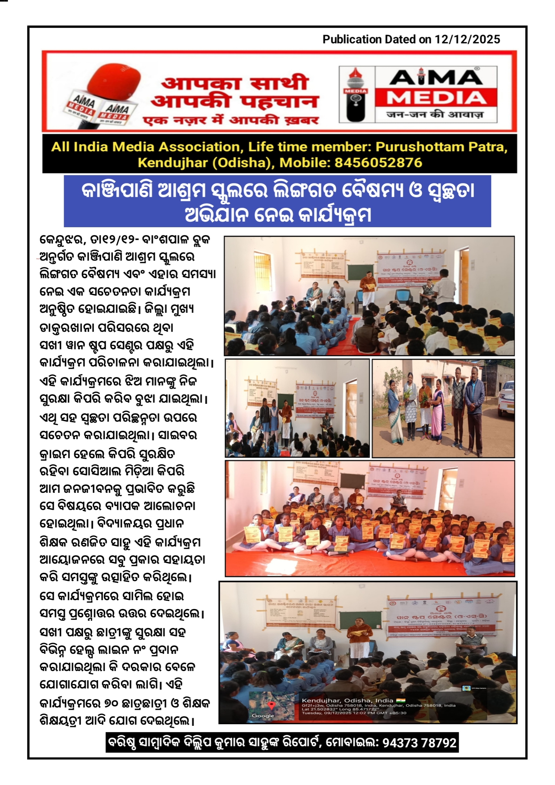 କାଞ୍ଜିପାଣି ଆଶ୍ରମ ସ୍କୁଲରେ ଲିଙ୍ଗଗତ ବୈଷମ୍ୟ ଓ ସ୍ୱଚ୍ଛତା ଅଭିଯାନ ନେଇ କାର୍ଯ୍ୟକ୍ରମ।