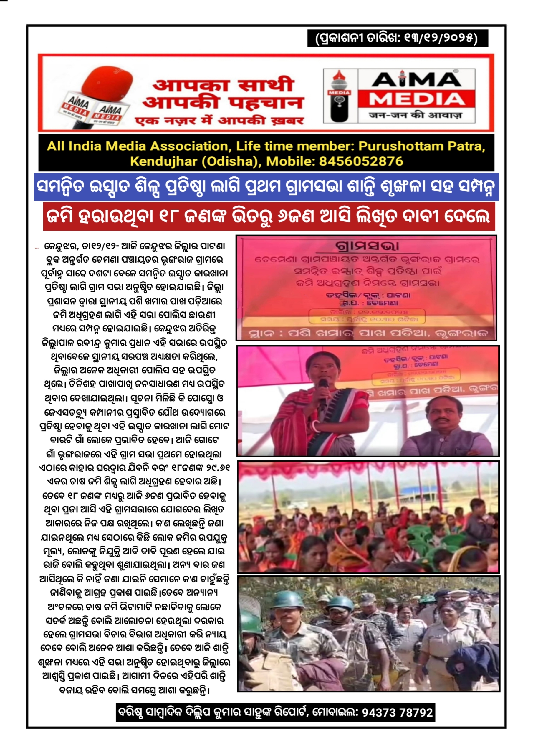 କେନ୍ଦୁଝର,ତା୧୨/୧୨- ଆଜି କେନ୍ଦୁଝର ଜିଲ୍ଲାର ପାଟଣା ବ୍ଲକ ଅନ୍ତର୍ଗତ ଚେମଣା ପଞ୍ଚାୟତର ଭୃଙ୍ଗରାଜ ଗ୍ରାମରେ ପୂର୍ବାହ୍ନ ସାଢେ ଦଶଟା ବେଳେ ସମନ୍ୱିତ ଇସ୍ପାତ କାରଖାନା ପ୍ରତିଷ୍ଠା ଲାଗି ଗ୍ରାମ ସଭା ଅନୁଷ୍ଠିତ ହୋଇଯାଇଛି। ଜିଲ୍ଲା ପ୍ରଶାସନ ଦ୍ୱାରା ସ୍ଥାନୀୟ ପଶି ଖମାର ପାଖ ପଡ଼ିଆରେ ଜମି ଅଧିଗ୍ରହଣ ଲାଗି ଏହି ସଭା ପୋଲିସ ଛାଉଣୀ ମଧ୍ୟରେ ସମ୍ପନ୍ନ ହୋଇଯାଇଛି। କେନ୍ଦୁଝର ଅତିରିକ୍ତ ଜିଲ୍ଲାପାଳ ରବୀନ୍ଦ୍ର କୁମାର ପ୍ରଧାନ ଏହି ସଭାରେ ଉପସ୍ଥିତ ଥିବାବେଳେ ସ୍ଥାନୀୟ ସରପଞ୍ଚ ଅଧ୍ୟକ୍ଷତା କରିଥିଲେ, ଜିଲ୍ଲାର ଅନେକ ଅଧିକାରୀ ପୋଲିସ ସହ ଉପସ୍ଥିତ ଥିଲେ। ତିନିଶହ ପାଖାପାଖି ଜନସାଧାରଣ ମଧ୍ୟ ଉପସ୍ଥିତ ଥିବାର ଦେଖାଯାଇଥିଲା। ସୂଚନା ମିଳିଛି କି ପୋସ୍କୋ ଓ ଜେଏସଡବ୍ଲ୍ୟୁ କମ୍ପାନୀର ପ୍ରସ୍ତାବିତ ଯୌଥ ଉଦ୍ୟୋଗରେ ପ୍ରତିଷ୍ଠା ହେଵାକୁ ଥିବା ଏହି ଇସ୍ପାତ କାରଖାନା ଲାଗି ମୋଟ ବାରଟି ଗାଁ ଲୋକେ ପ୍ରଭାବିତ ହେବେ। ଆଜି ଗୋଟେ ଗାଁ ଭୃଙ୍ଗରାଜରେ ଏହି ଗ୍ରାମ ସଭା ପ୍ରଥମେ ହୋଇଥିଲା ଏଠାରେ କାହାର ଘରଦ୍ୱାର ଯିବନି ବରଂ ୧୮ଜଣଙ୍କ ୨୯.୬୧ ଏକର ଚାଷ ଜମି ଶିଳ୍ପ ଲାଗି ଅଧିଗ୍ରହଣ ହେବାର ଅଛି ।ତେବେ ୧୮ ଜଣଙ୍କ ମଧ୍ୟରୁ ଆଜି ୬ଜଣ ପ୍ରଭାବିତ ହେବାକୁ ଥିବା ପ୍ରଜା ଆସି ଏହି ଗ୍ରାମସଭାରେ ଯୋଗଦେଇ ଲିଖିତ ଆକାରରେ ନିଜ ପକ୍ଷ ରଖିଥିଲେ। କ'ଣ ଲେଖିଛନ୍ତି ଜଣା ଯାଇନଥିଲେ ମଧ୍ୟ ସେଠାରେ କିଛି ଲୋକ ଜମିର ଉପଯୁକ୍ତ ମୂଲ୍ୟ, ଲୋକଙ୍କୁ ନିଯୁକ୍ତି ଆଦି ଦାବି ପୂରଣ ହେଲେ ଯାଇ ରାଜି ବୋଲି କହୁଥିବା ଶୁଣାଯାଇଥିଲା। ଅନ୍ୟ ବାର ଜଣ ଆସିଥିଲେ କି ନାହିଁ ଜଣା ଯାଇନି ସେମାନେ କ'ଣ ଚାହୁଁଛନ୍ତି ଜାଣିବାକୁ ଆଗ୍ରହ ପ୍ରକାଶ ପାଇଛି।ତେବେ ଅନ୍ୟାନ୍ୟ ଅଂଚଳରେ ଚାଷ ଜମି ଭିଟାମାଟି ନଛାଡିବାକୁ ଲୋକେ ସତର୍କ ଅଛନ୍ତି ବୋଲି ଆଲୋଚନା ହେଉଥିଲା ଦରକାର ହେଲେ ଗ୍ରାମସଭା ବିଚାର ବିଭାଗ ଅଧିକାରୀ କରି ନ୍ୟାୟ ଦେବେ ବୋଲି ଅନେକ ଆଶା କରିଛନ୍ତି। ତେବେ ଆଜି ଶାନ୍ତି ଶୃଙ୍ଖଳା ମଧ୍ୟରେ ଏହି ସଭା ଅନୁଷ୍ଠିତ ହୋଇଥିବାରୁ ଜିଲ୍ଲାରେ ଆଶ୍ବସ୍ତି ପ୍ରକାଶ ପାଇଛି। ଆଗାମୀ ଦିନରେ ଏହିପରି ଶାନ୍ତି ବଜାୟ ରହିବ ବୋଲି ସମସ୍ତେ ଆଶା କରୁଛନ୍ତି।