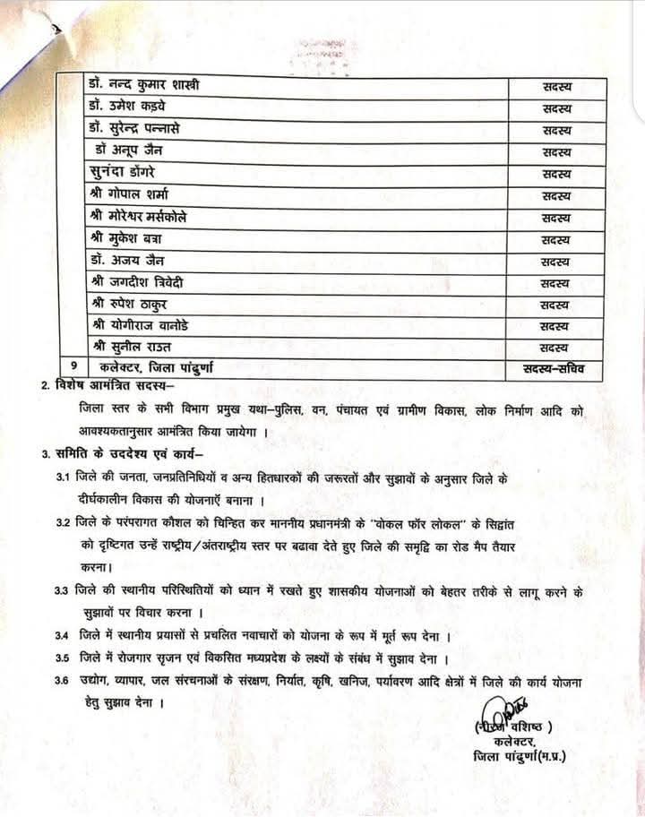 सदस्य-सचिव: कलेक्टर नीरज कुमार वशिष्ठ, जिला पांढुर्णा