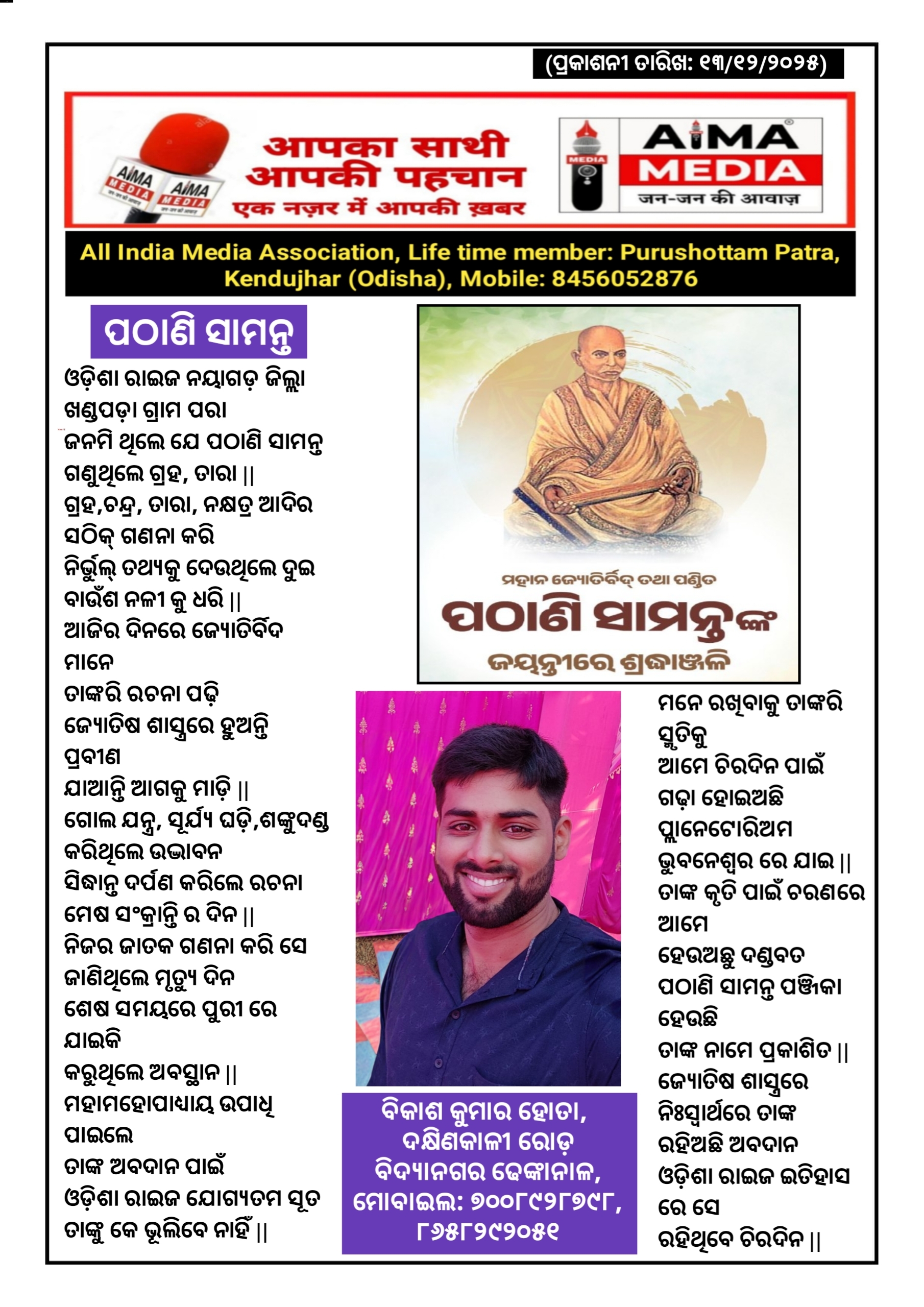 ବିକାଶ କୁମାର ହୋତା, ଦକ୍ଷିଣକାଳୀ ରୋଡ଼ ବିଦ୍ୟାନଗର ଢେଙ୍କାନାଳ, ମୋବାଇଲ: ୭୦୦୮୯୨୮୭୯୮, ୮୬୫୮୨୯୨୦୫୧