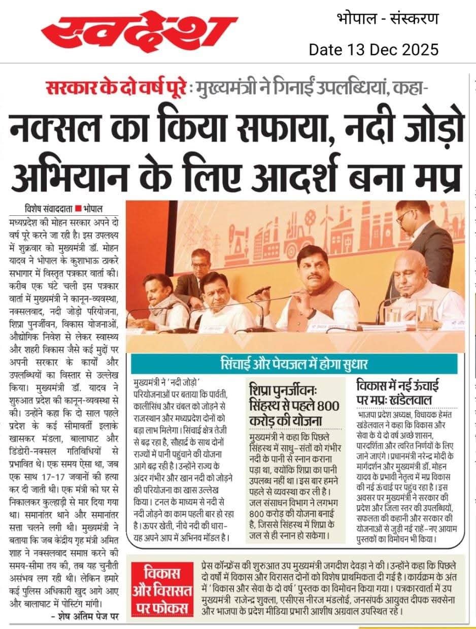 सरकार के दो वर्ष पूरे : मुख्यमंत्री डॉ. मोहन यादव ने गिनाईं उपलब्धियां, कहा नक्सल का किया सफाया, नदी जोड़ो अभियान के लिए आदर्श बना मध्यप्रदेश