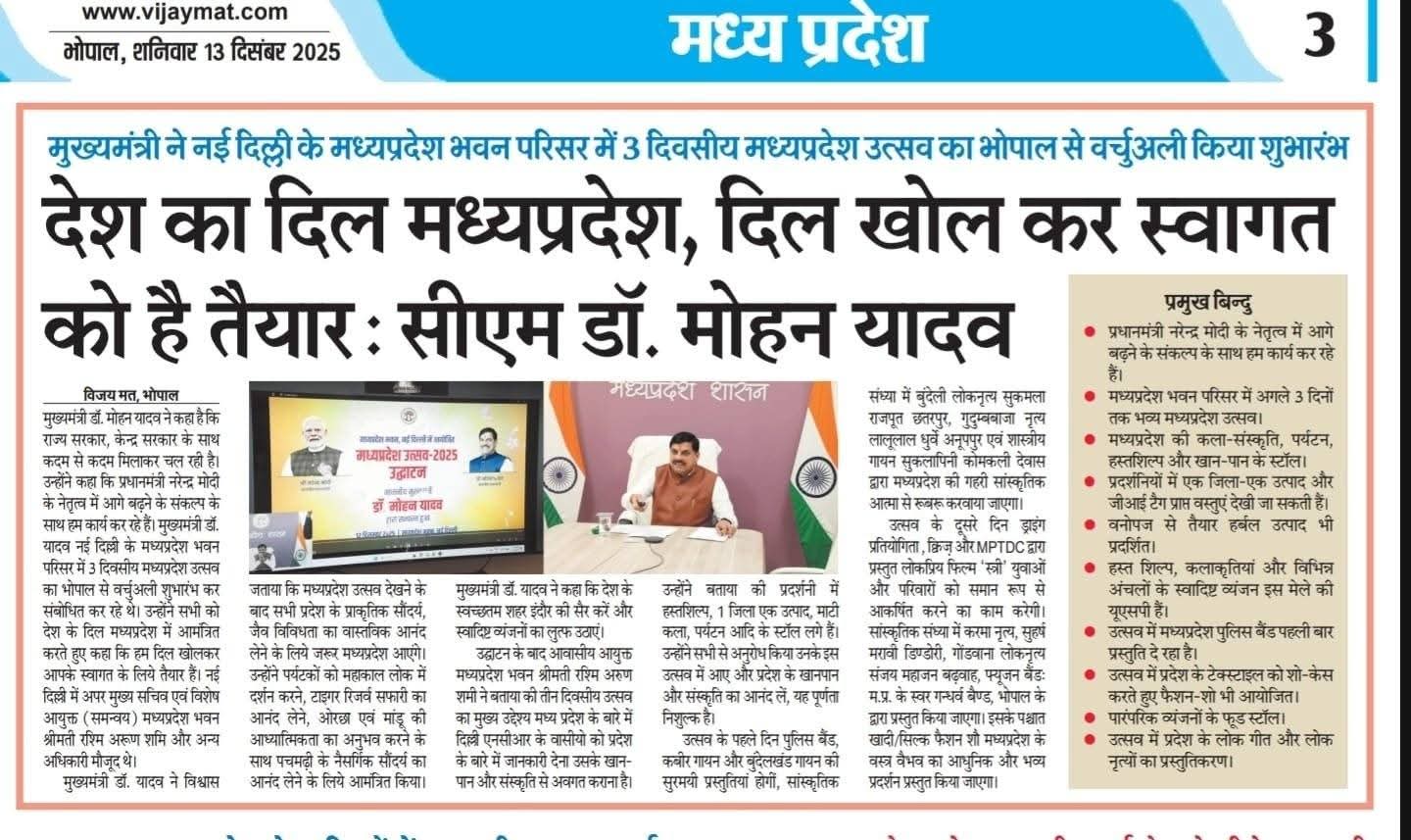 ▶️मुख्यमंत्री ने नई दिल्ली के मध्यप्रदेश भवन परिसर में 3 दिवसीय मध्यप्रदेश उत्सव का भोपाल से वर्चुअली किया शुभारंभ