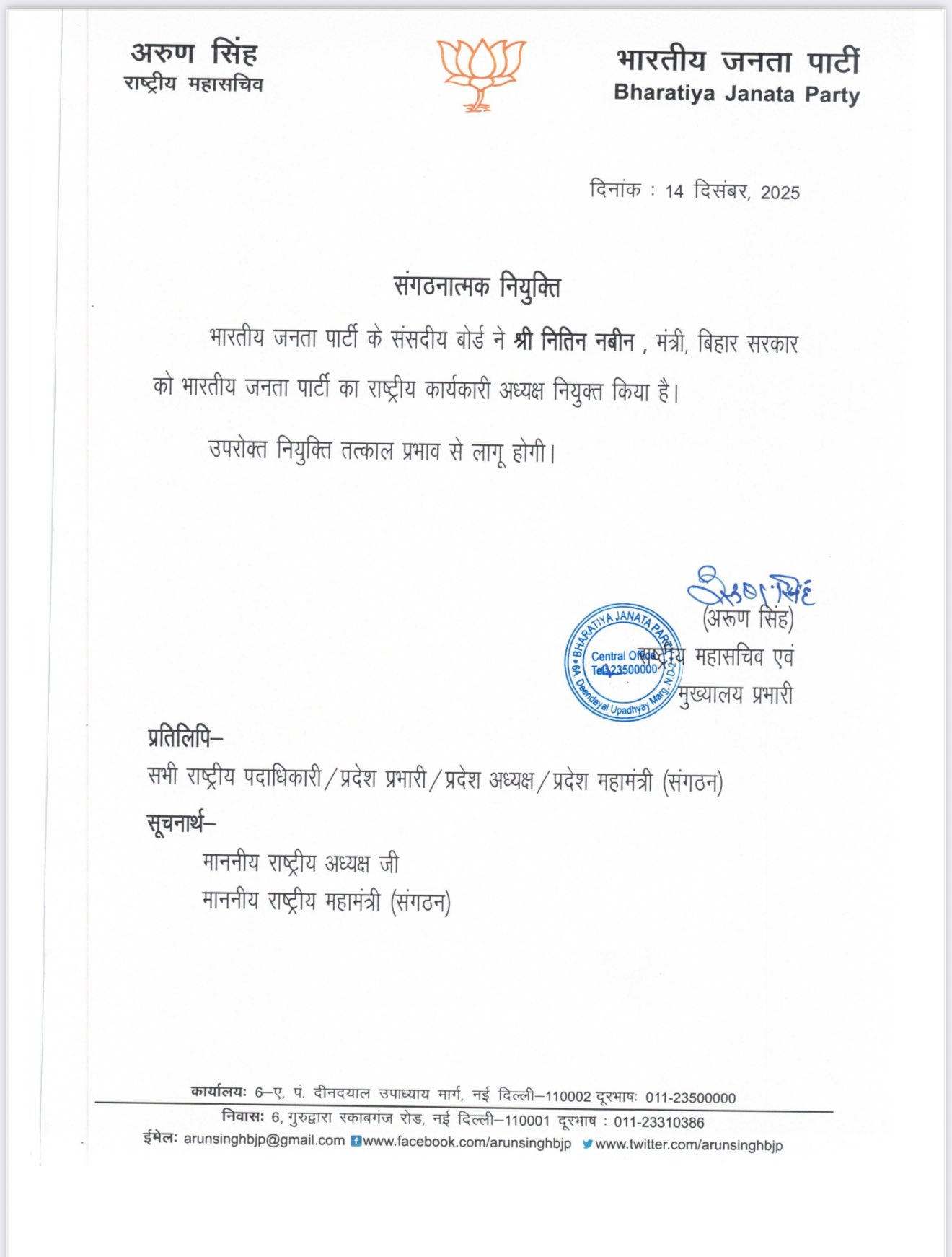 भारतीय जनता पार्टी के संसदीय बोर्ड ने श्री नितिन नबीन , मंत्री ,बिहार सरकार को भारतीय जनता पार्टी का राष्ट्रीय कार्यकारी अध्यक्ष नियुक्त किया गया है!