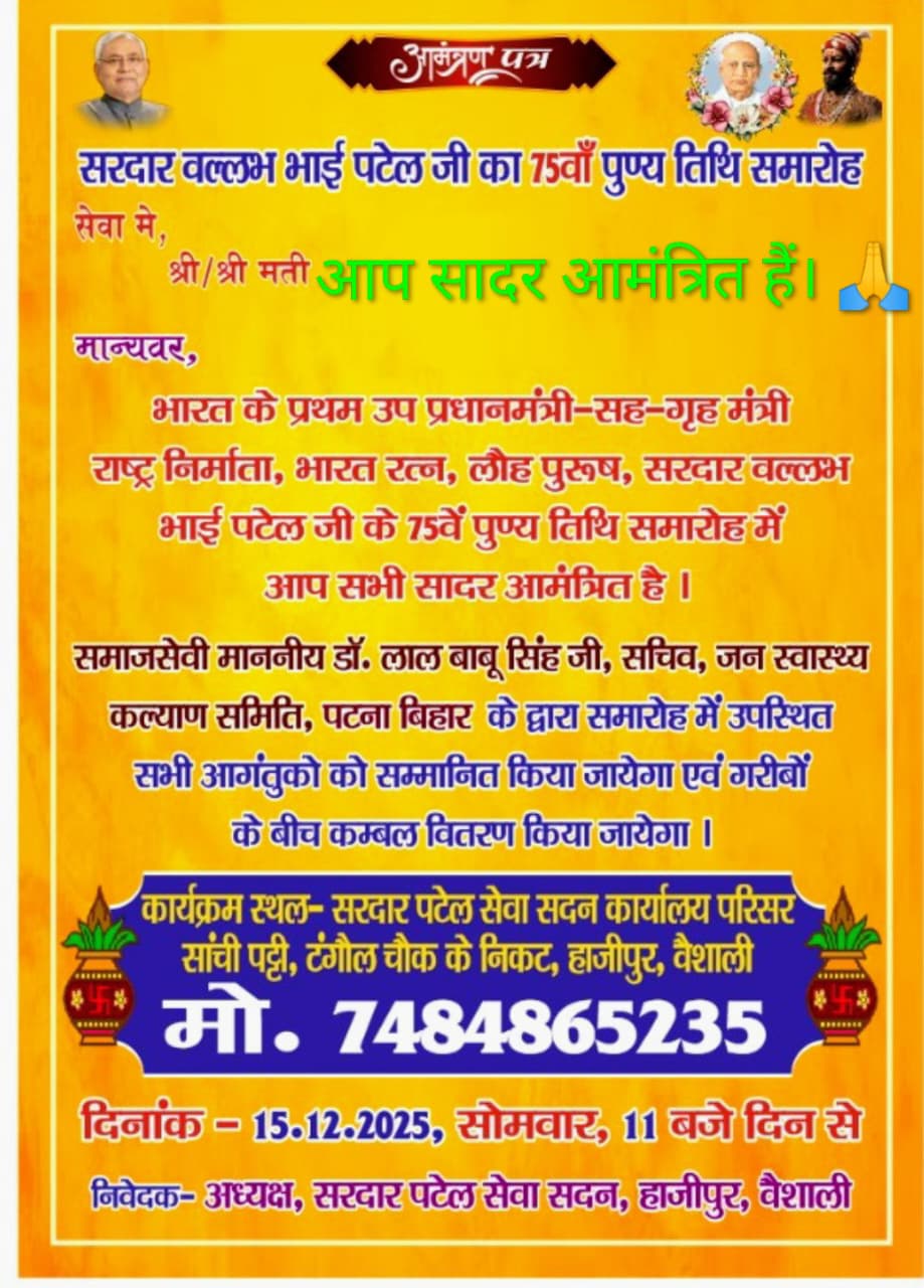 हाजीपुर/भारत के प्रथम उप प्रधानमंत्री एवं गृह मंत्री, लौह पुरुष सरदार वल्लभ भाई पटेल की 75वीं पुण्यतिथि के अवसर पर 15 दिसंबर (सोमवार) को हाजीपुर में स्मृति एवं सेवा समारोह का आयोजन किया जाएगा। कार्यक्रम सरदार पटेल सेवा सदन, कार्यालय परिसर, सांची पट्टी, तंगौल चौक के निकट में पूर्वाह्न 11 बजे से शुरू होगा। आयोजन सरदार पटेल सेवा सदन, हाजीपुर की ओर से किया जा रहा है। समारोह में समाजसेवी डॉ. लाल बाबू सिंह, सचिव, जन स्वास्थ्य कल्याण समिति, पटना मुख्य अतिथि के रूप में मौजूद रहेंगे। कार्यक्रम के दौरान अतिथियों को सम्मानित किया जाएगा तथा जरूरतमंदों के बीच कंबल वितरण किया जाएगा। आयोजक ने बताया कि सरदार पटेल का जीवन राष्ट्र की एकता और अखंडता को समर्पित रहा हैं। उनकी पुण्यतिथि पर सेवा कार्य के माध्यम से उनके विचारों को जन-जन तक पहुंचाने का प्रयास किया जा रहा है। आयोजकों ने शहरवासियों से अधिक संख्या में शामिल होकर कार्यक्रम को सफल बनाने की अपील की है।
