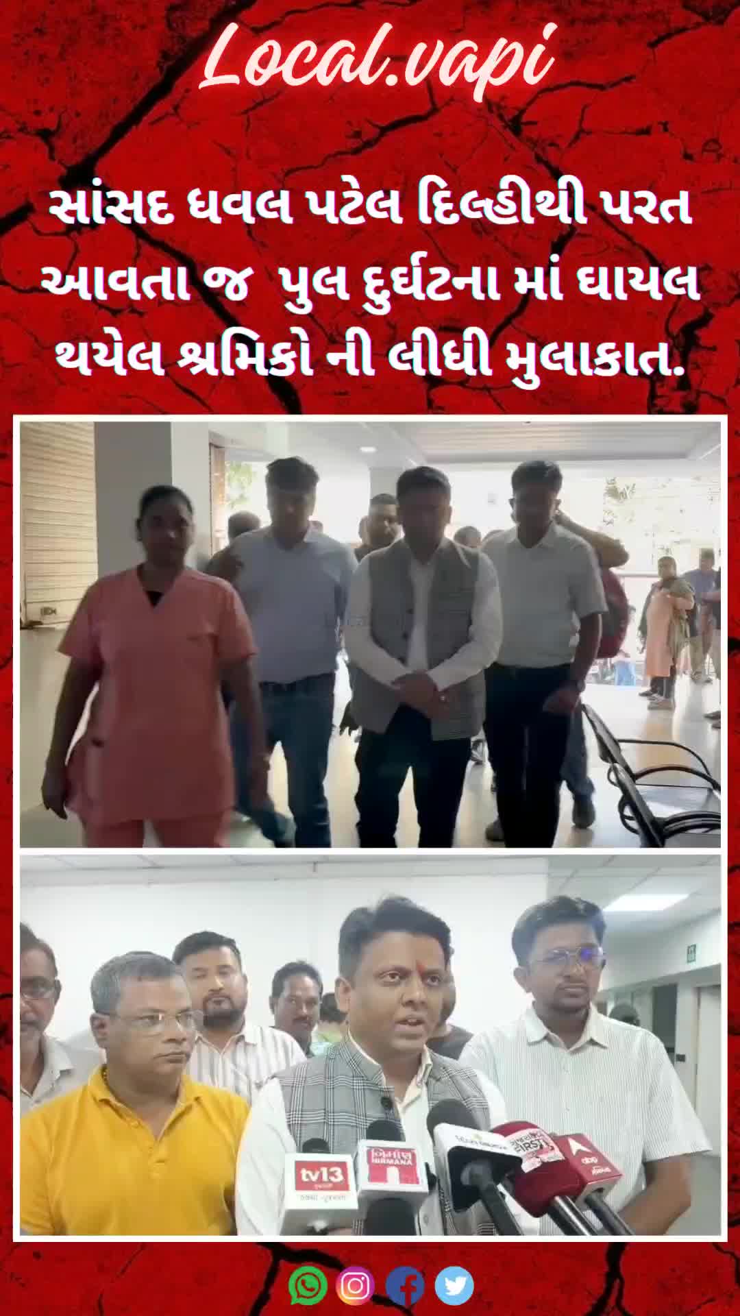 સાંસદ ધવલ પટેલ દિલ્હીથી પરત આવતા જ પુલ દુર્ઘટના માં ઘાયલ થયેલ શ્રમિકો ની લીધી મુલાકાત.