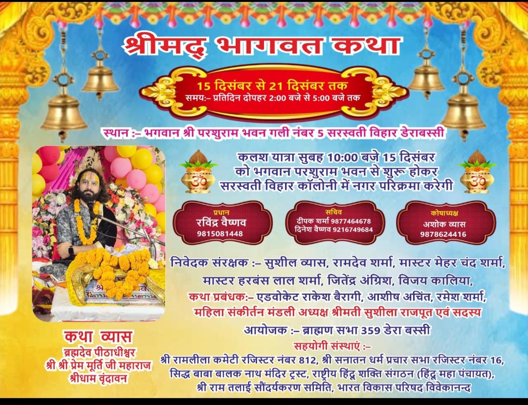 उपरांत भव्य कलश यात्रा निकल जाएगी इसलिए *आप परिवार सहित भगवान परशुराम भवन गली नंबर 5 सरस्वती विहार डेराबस्सी पधारे* आपका इंतजार करते हुए:– ब्राह्मण सभा डेराबस्सी 359