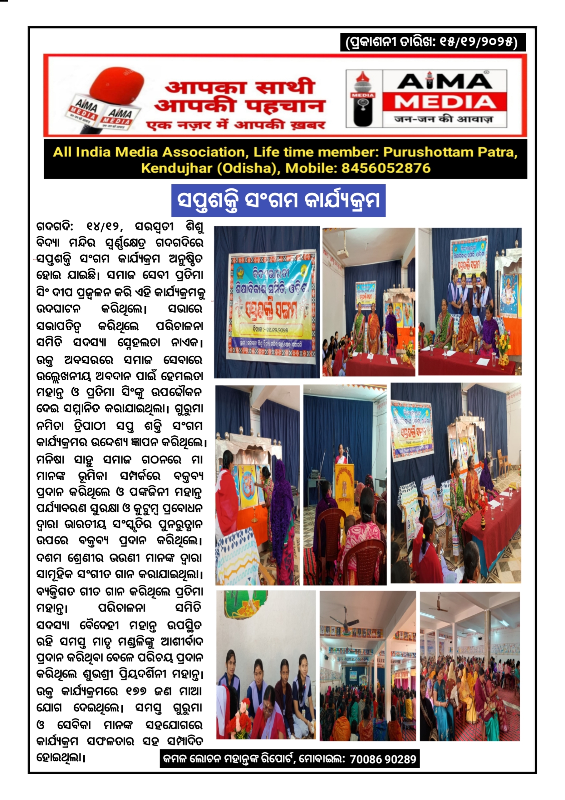 ସରସ୍ଵତୀ ଶିଶୁ ବିଦ୍ୟା ମନ୍ଦିର ସ୍ୱର୍ଣ୍ଣକ୍ଷେତ୍ର ଗଦଗଦିରେ ସପ୍ତ ଶକ୍ତି ସଂଗମ କାର୍ଯ୍ୟକ୍ରମ ଅନୁଷ୍ଠିତ ହୋଇ ଯାଇଛି।ସମାଜ ସେବୀ ପ୍ରତିମା ସିଂ ଦୀପ ପ୍ରଜ୍ବଳନ କରି ଏହି କାର୍ଯ୍ୟକ୍ରମକୁ ଉଦଘାଟନ କରିଥିଲେ। ସଭାରେ ସଭାପତିତ୍ବ କରିଥିଲେ ପରିଚାଳନା ସମିତି ସଦସ୍ୟା ସ୍ନେହଲତା ନାଏକ। ଉକ୍ତ ଅବସରରେ ସମାଜ ସେବାରେ ଉଲ୍ଲେଖନୀୟ ଅବଦାନ ପାଇଁ ହେମଲତା ମହାନ୍ତ ଓ ପ୍ରତିମା ସିଂଙ୍କୁ ଉପଢୌକନ ଦେଇ ସମ୍ମାନିତ କରାଯାଇଥିଲା।ଗୁରୁମା ନମିତା ତ୍ରିପାଠୀ ସପ୍ତ ଶକ୍ତି ସଂଗମ କାର୍ଯ୍ୟକ୍ରମର ଉଦ୍ଦେଶ୍ୟ ଜ୍ଞାପନ କରିଥିଲେ। ମନିଷା ସାହୁ ସମାଜ ଗଠନରେ ମା ମାନଙ୍କ ଭୂମିକା ସମ୍ପର୍କରେ ବକ୍ତବ୍ୟ ପ୍ରଦାନ କରିଥିଲେ ଓ ପଙ୍କଜିନୀ ମହାନ୍ତ ପର୍ଯ୍ୟାବରଣ ସୁରକ୍ଷା ଓ କୁଟୁମ୍ବ ପ୍ରବୋଧନ ଦ୍ୱାରା ଭାରତୀୟ ସଂସ୍କୃତିର ପୁନରୁତ୍ଥାନ ଉପରେ ବକ୍ତବ୍ୟ ପ୍ରଦାନ କରିଥିଲେ। ଦଶମ ଶ୍ରେଣୀର ଭଉଣୀ ମାନଙ୍କ ଦ୍ଵାରା ସାମୂହିକ ସଂଗୀତ ଗାନ କରାଯାଇଥିଲା। ବ୍ୟକ୍ତିଗତ ଗୀତ ଗାନ କରିଥିଲେ ପ୍ରତିମା ମହାନ୍ତ। ପରିଚାଳନା ସମିତି ସଦସ୍ୟା ବୈଦେହୀ ମହାନ୍ତ ଉପସ୍ଥିତ ରହି ସମସ୍ତ ମାତୃ ମଣ୍ଡଳିଙ୍କୁ ଆଶୀର୍ବାଦ ପ୍ରଦାନ କରିଥିବା ବେଳେ ପରିଚୟ ପ୍ରଦାନ କରିଥିଲେ ଶୁଭଶ୍ରୀ ପ୍ରିୟଦର୍ଶିନୀ ମହାନ୍ତ। ଉକ୍ତ କାର୍ଯ୍ୟକ୍ରମରେ ୧୭୭ ଜଣ ମାଆ ଯୋଗ ଦେଇଥିଲେ। ସମସ୍ତ ଗୂରୁମା ଓ ସେବିକା ମାନଙ୍କ ସହଯୋଗରେ କାର୍ଯ୍ୟକ୍ରମ ସଫଳତାର ସହ ସମ୍ପାଦିତ ହୋଇଥିଲା।