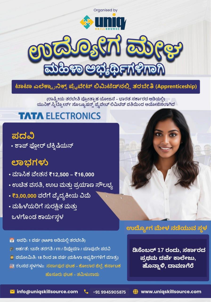 ಹೊನ್ನಾಳಿ:ಸರ್ಕಾರಿ ಪ್ರಥಮ ದರ್ಜೆ ಕಾಲೇಜು, ಹೊನ್ನಾಳಿ ಇಲ್ಲಿ ಐಕ್ಯುಎಸಿ ಹಾಗೂ ಉದ್ಯೋಗ ಭರವಸಾ ಕೋಶದಡಿ ಯೂನಿಕ್ ಸ್ಕಿಲ್ ಸೋರ್ಸ್ ಸಂಸ್ಥೆಯ ಸಹಯೋಗದಲ್ಲಿ ಮಹಿಳಾ ಅಭ್ಯರ್ಥಿಗಳಿಗಾಗಿ ಉದ್ಯೋಗ ಮೇಳವನ್ನು ಆಯೋಜಿಸಲಾಗಿದೆ. ದಿನಾಂಕ 17-12-2025 (ಬುಧವಾರ) ರಂದು ಈ ಉದ್ಯೋಗ ಮೇಳವು ನಡೆಯಲಿದ್ದು, ಪ್ರಸಿದ್ಧ TATA Electronics Company ಯಲ್ಲಿ ನೇರ ಉದ್ಯೋಗಾವಕಾಶವನ್ನು ಈ ಮೂಲಕ ಒದಗಿಸಲಾಗುತ್ತದೆ.