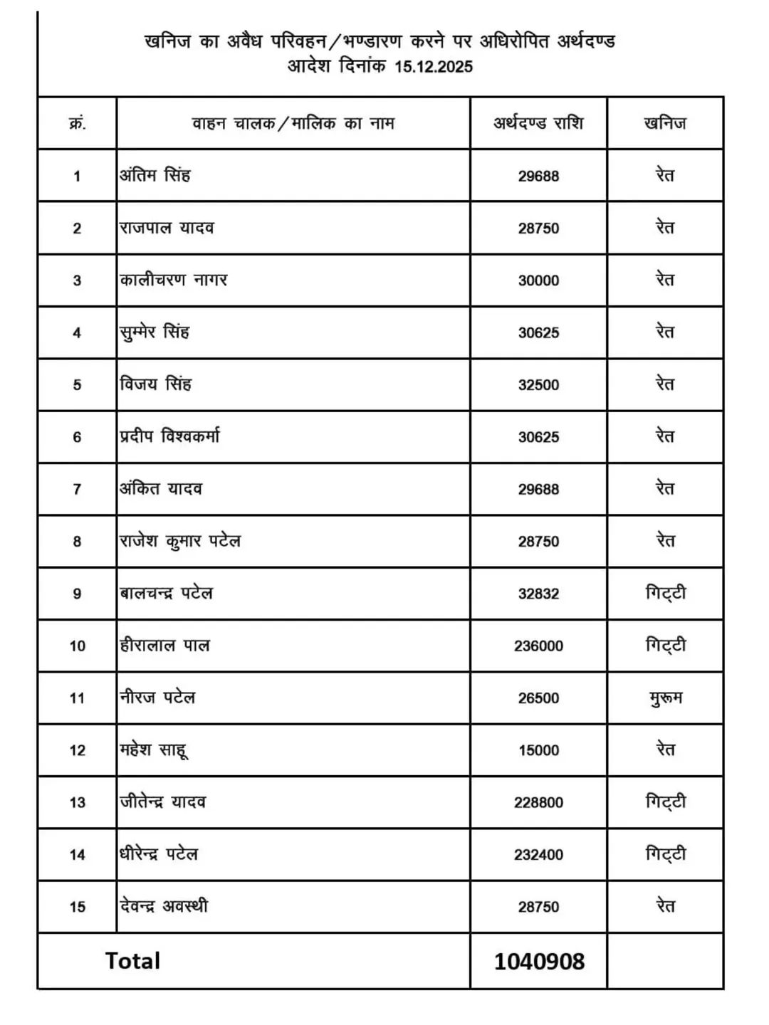 कलेक्टर छतरपुर श्री पार्थ जैसवाल ने 15 अनावेदक के खिलाफ अवैध रूप से उत्खनन, परिवहन व भंडारण करने पर खनिज विभाग में दर्ज प्रकरणों में प्रतिवेदन के आधार पर 15 दिसंबर 2025 को कुल 10 लाख 40 हजार 908 रुपए राशि की पेनाल्टी अधिरोपित की है। अवैध रेत में अनावेदक अंतिम सिंह पर 29688 रुपए, राजपाल यादव पर 28750 रुपए, कालीचरण नागर पर 30000 रुपए, सुम्मेर सिंह पर 30625 रुपए, विजय सिंह पर 32500 रुपए, प्रदीप विश्वकर्मा पर 30625 रुपए, अंकित यादव पर 29688 रुपए, राजेश कुमार पटेल पर 28750 रुपए, महेश साहू पर 15000 रुपए, देवेंद्र अवस्थी पर 28750 रुपए और अवैध गिट्टी में बालचंद्र पटेल पर 32832 रुपए, हीरालाल पाल पर 236000 रुपए, धीरेन्द्र पटेल पर 232400 रुपए एवं नीरज पटेल पर 26500 रुपए का अवैध मुरूम का परिवहन करने पर अर्थदंड अधिरोपित किया है। साथ ही राशि जमा कराने के आदेश दिए गए।