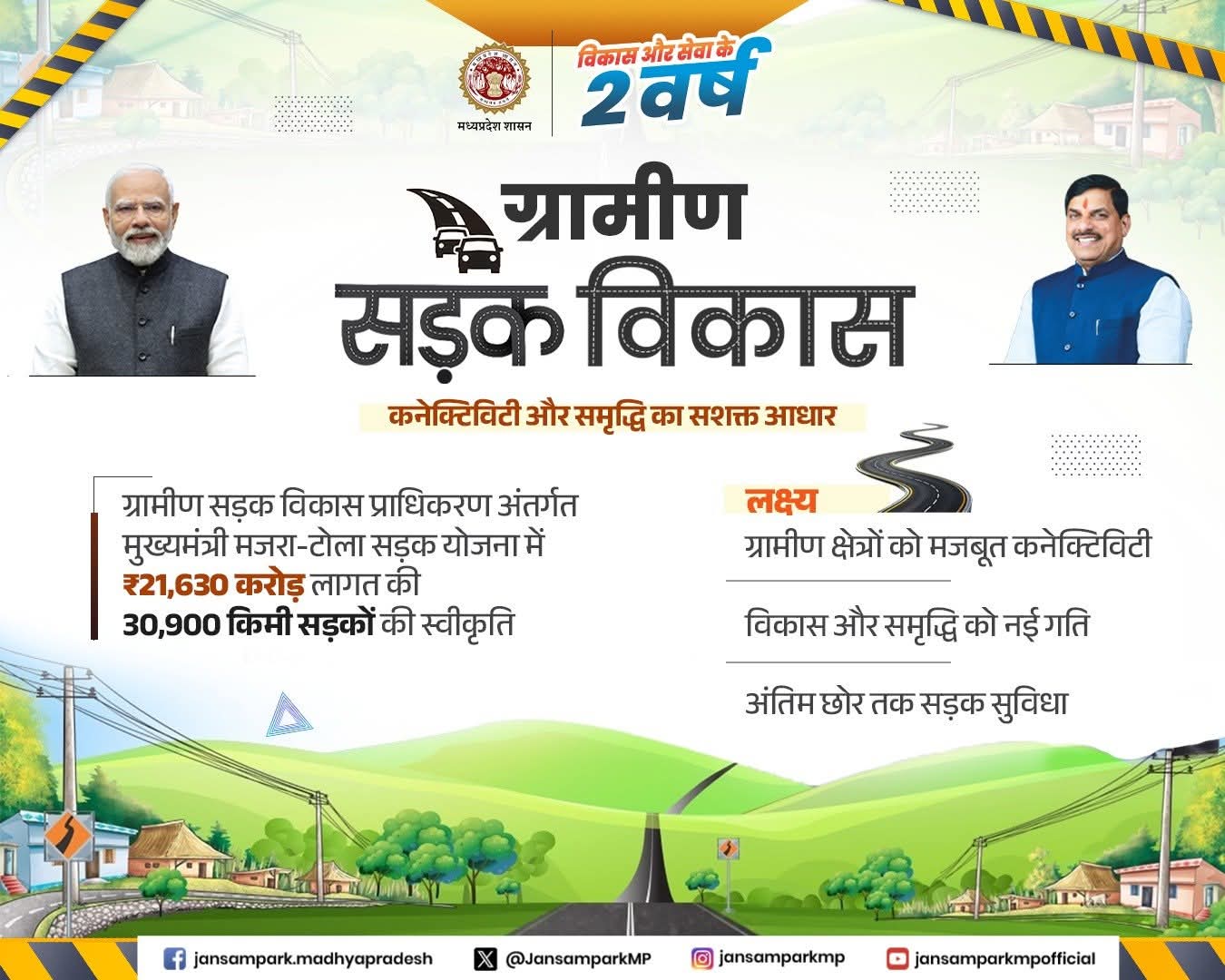ग्रामीण सड़क विकास प्राधिकरण अंतर्गत मुख्यमंत्री मजरा-टोला सड़क योजना में ₹21,630 करोड़ लागत की 30,900 किमी सड़कों की स्वीकृति