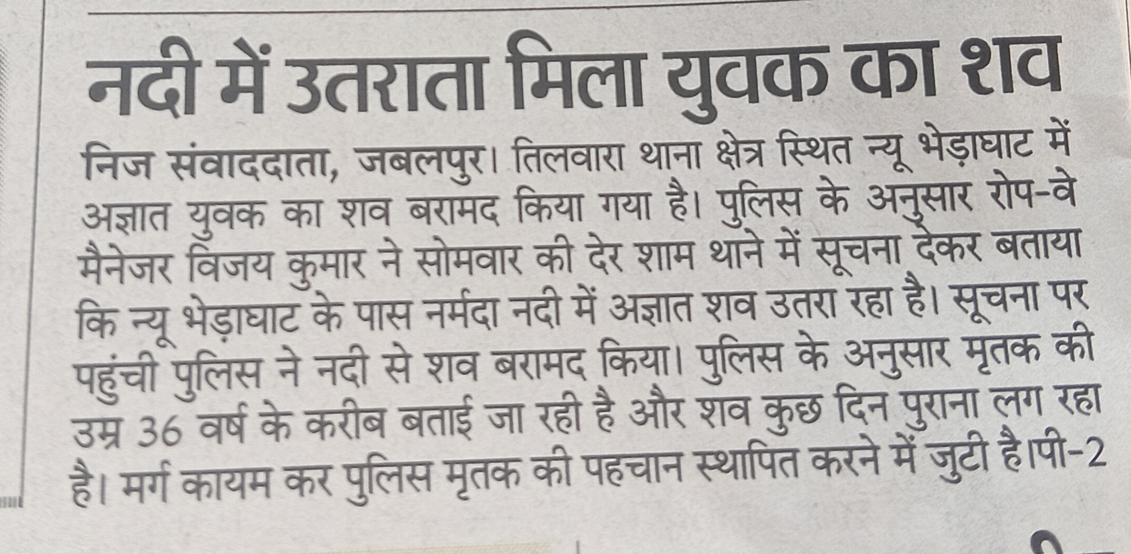 तिलवारा थाना क्षेत्र स्थित न्यू भेड़ाघाट में अज्ञात युवक‌‌‌ का शव बरामद किया गया है