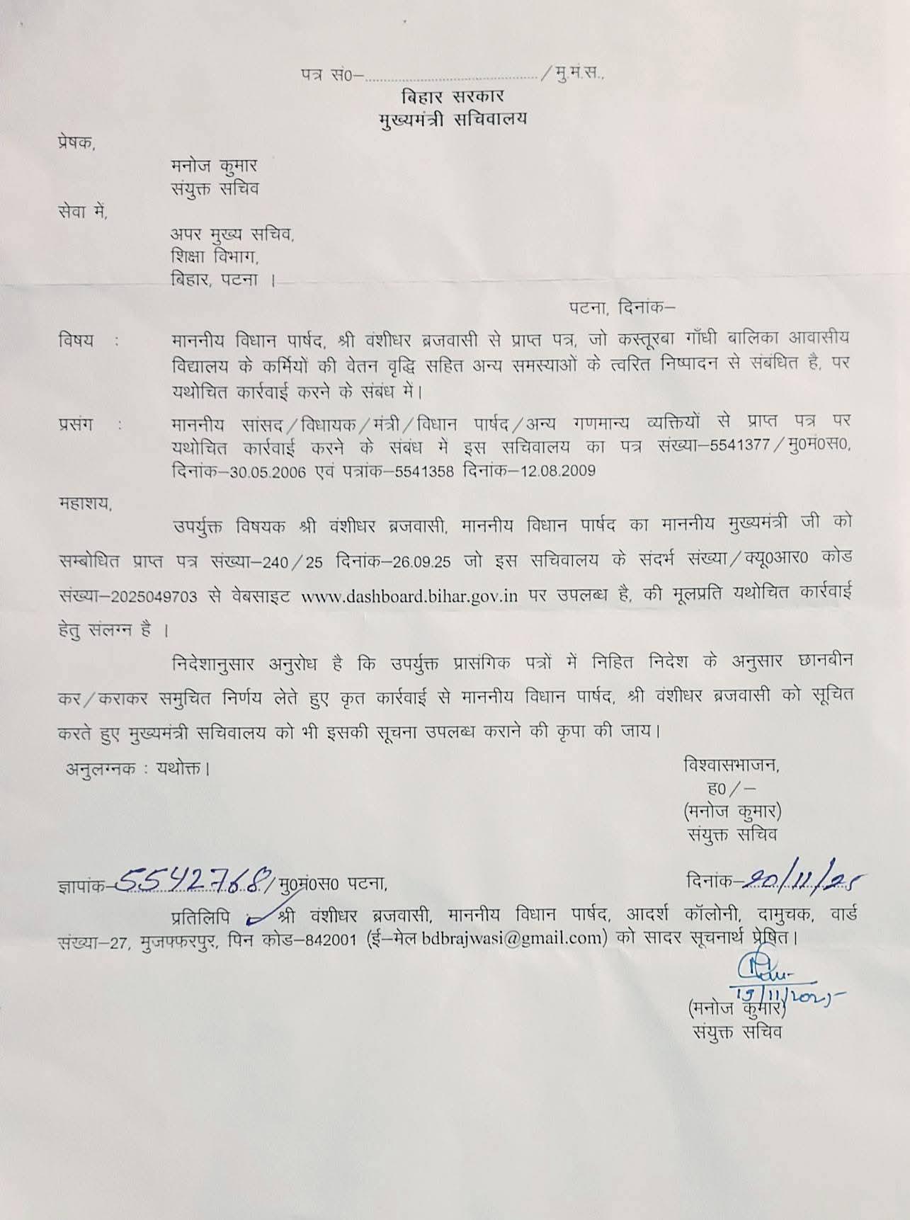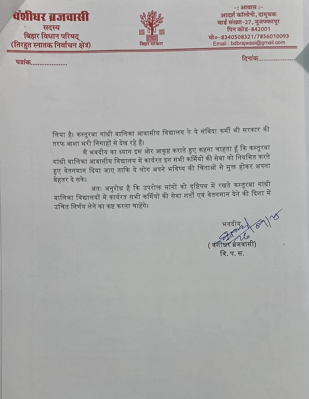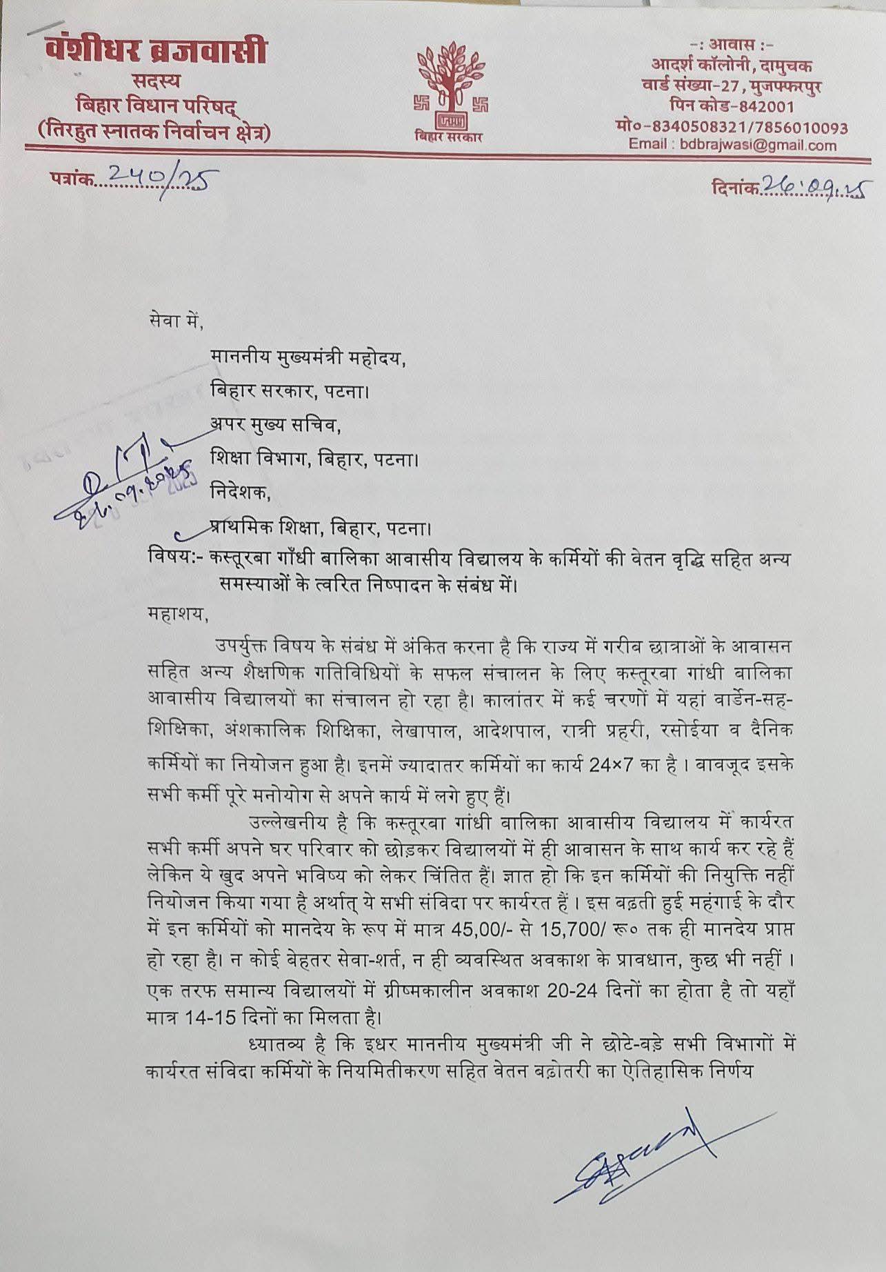 राज्य में बालिकाओं की शिक्षा और सुरक्षा के लिए संचालित कस्तूरबा गांधी बालिका आवासीय विद्यालय (KGBV) में कार्यरत कर्मियों के साथ वर्षों से हो रहे अन्याय का मुद्दा अब सरकार के उच्च स्तर तक पहुंच गया है। बिहार विधान परिषद सदस्य वशीधर ब्रजवासी ने इस संबंध में माननीय मुख्यमंत्री को पत्र लिखकर KGBV की वार्डन-सह-शिक्षिकाओं, अंशकालिक शिक्षिकाओं, लेखापालों, आदेशपालों, रात्रि प्रहरियों, रसोइयों सहित सभी दैनिक कर्मियों की वेतन वृद्धि, सेवा-शर्तों में सुधार और नियमितीकरण की मांग की है।