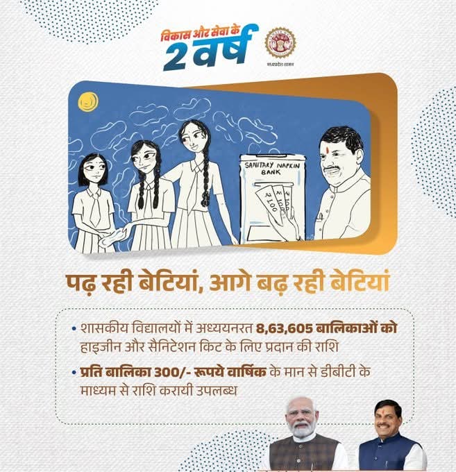 शासकीय विद्यालयों में अध्‍ययनरत 8,63,605 बालिकाओं को हाइजीन और सैनिटेशन किट के लिए प्रदान की राशि