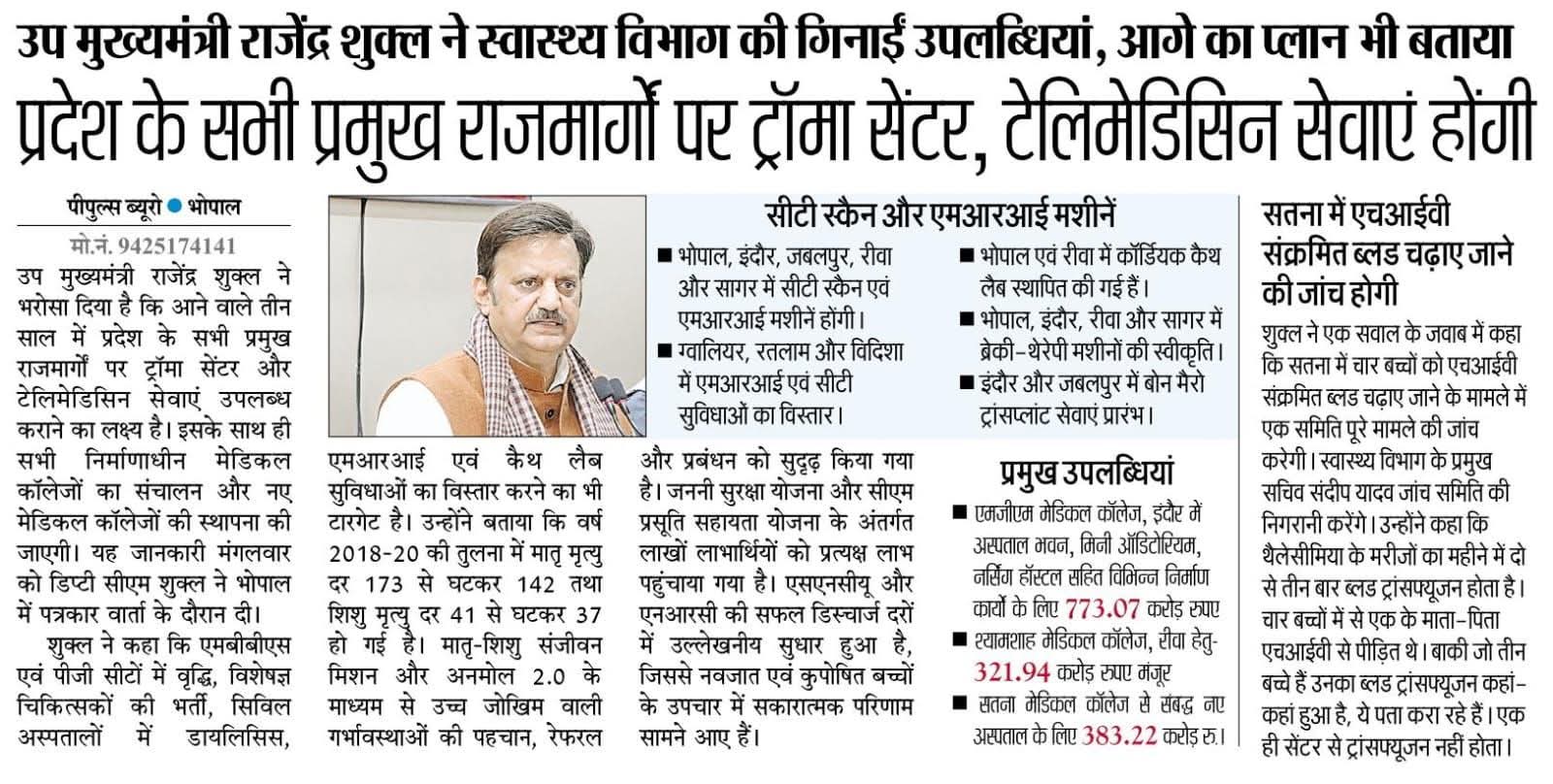 उप मुख्यमंत्री श्री Rajendra Shukla ने दी स्वास्थ्य एवं चिकित्सा शिक्षा के क्षेत्र में पिछले दो साल की उपलब्धियों की जानकारी