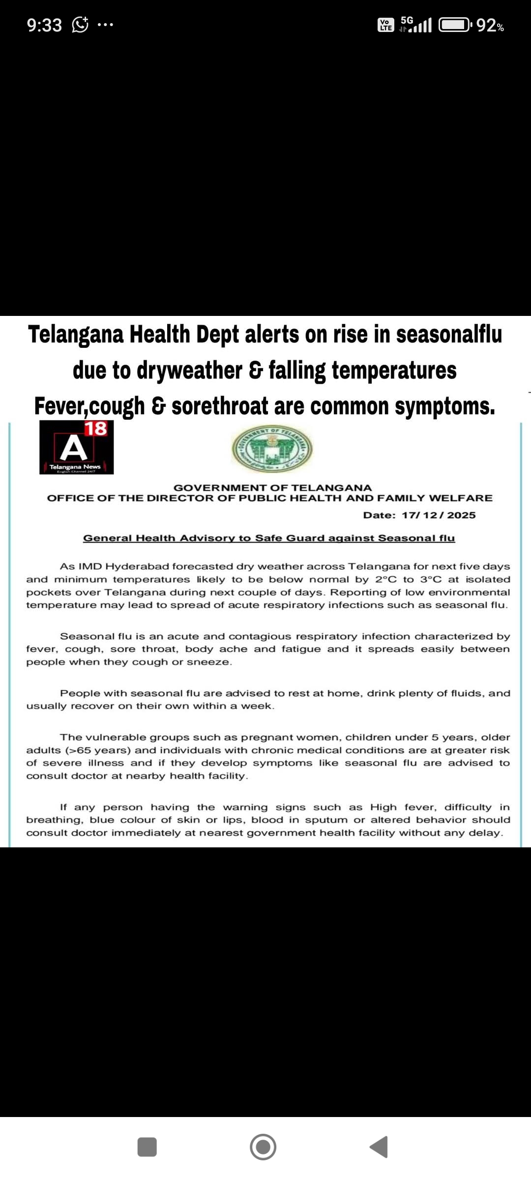 Telangana Health Dept alerts on rise in seasonalflu due to dryweather & falling temperatures.