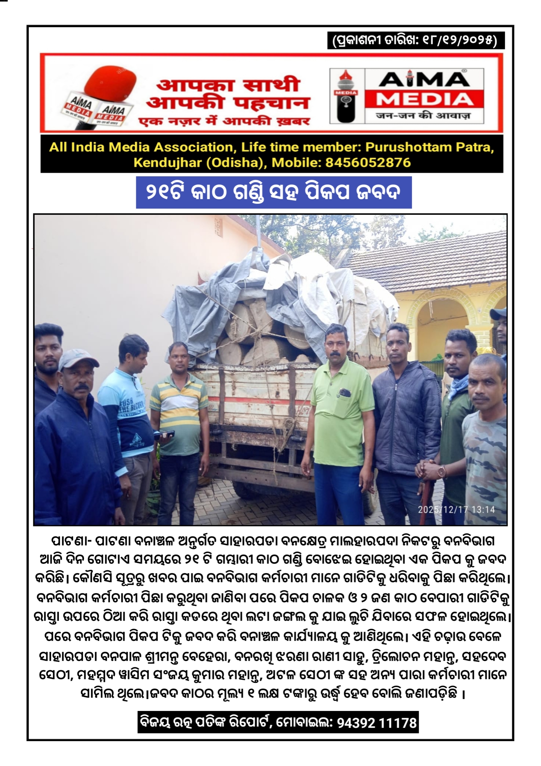 ପାଟଣା- ପାଟଣା ବନାଞ୍ଚଳ ଅନ୍ତର୍ଗତ ସାହାରପଡା ବନକ୍ଷେତ୍ର ମାଲହାରପଦା ନିକଟରୁ ବନବିଭାଗ ଆଜି ଦିନ ଗୋଟାଏ ସମୟରେ ୨୧ ଟି ଗମ୍ଭାରୀ କାଠ ଗଣ୍ଡି ବୋଝେଇ ହୋଇଥିବା ଏକ ପିକପ କୁ ଜବଦ କରିଛି। କୌଣସି ସୂତ୍ରରୁ ଖବର ପାଇ ବନବିଭାଗ କର୍ମଚାରୀ ମାନେ ଗାଡିଟିକୁ ଧରିବାକୁ ପିଛା କରିଥିଲେ।ବନବିଭାଗ କର୍ମଚାରୀ ପିଛା କରୁଥିବା ଜାଣିବା ପରେ ପିକପ ଚାଳକ ଓ ୨ ଜଣ କାଠ ବେପାରୀ ଗାଡିଟିକୁ ରାସ୍ତା ଉପରେ ଠିଆ କରି ରାସ୍ତା କଡରେ ଥିବା ଲଟା ଜଙ୍ଗଲ କୁ ଯାଇ ଲୁଚି ଯିବାରେ ସଫଳ ହୋଇଥିଲେ। ପରେ ବନବିଭାଗ ପିକପ ଟିକୁ ଜବଦ କରି ବନାଞ୍ଚଳ କାର୍ଯ୍ୟାଳୟ କୁ ଆଣିଥିଲେ। ଏହି ଚଢ଼ାଉ ବେଳେ ସାହାରପଡା ବନପାଳ ଶ୍ରୀମନ୍ତ ବେହେରା, ବନରଖି ଝରଣା ରାଣୀ ସାହୁ, ତ୍ରିଲୋଚନ ମହାନ୍ତ, ସହଦେବ ସେଠୀ, ମହମ୍ମଦ ୱାସିମ ସଂଜୟ କୁମାର ମହାନ୍ତ, ଅଟଳ ସେଠୀ ଙ୍କ ସହ ଅନ୍ୟ ପାରା କର୍ମଚାରୀ ମାନେ ସାମିଲ ଥିଲେ।ଜବଦ କାଠର ମୂଲ୍ୟ ୧ ଲକ୍ଷ ଟଙ୍କାରୁ ଉର୍ଦ୍ଧ୍ବ ହେବ ବୋଲି ଜଣାପଡ଼ିଛି ।