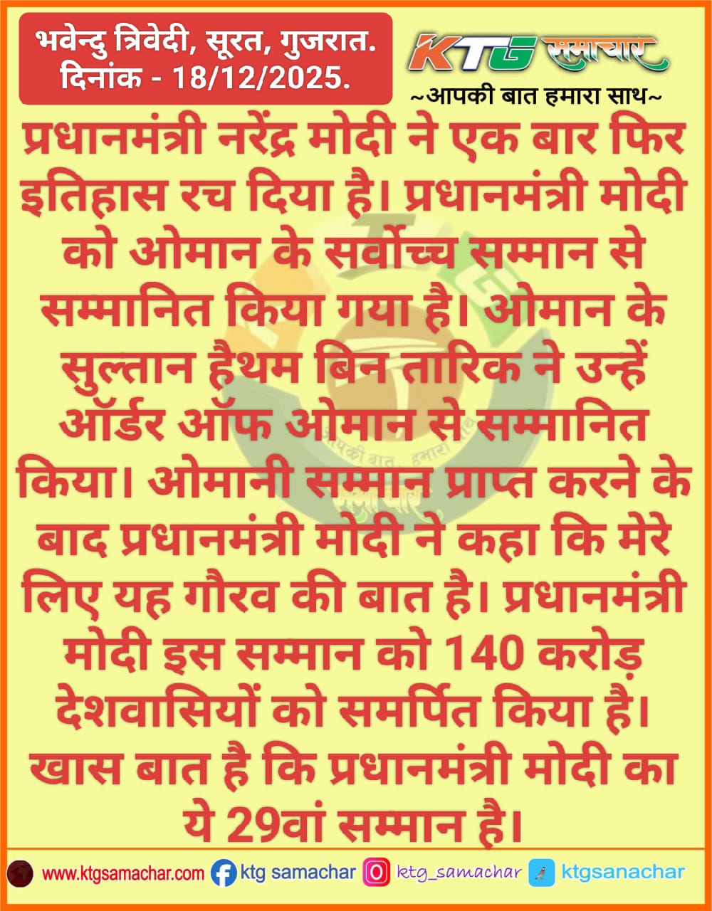 प्रधानमंत्री मोदी को ओमान के सर्वोच्च सम्मान से सम्मानित किया गया है।