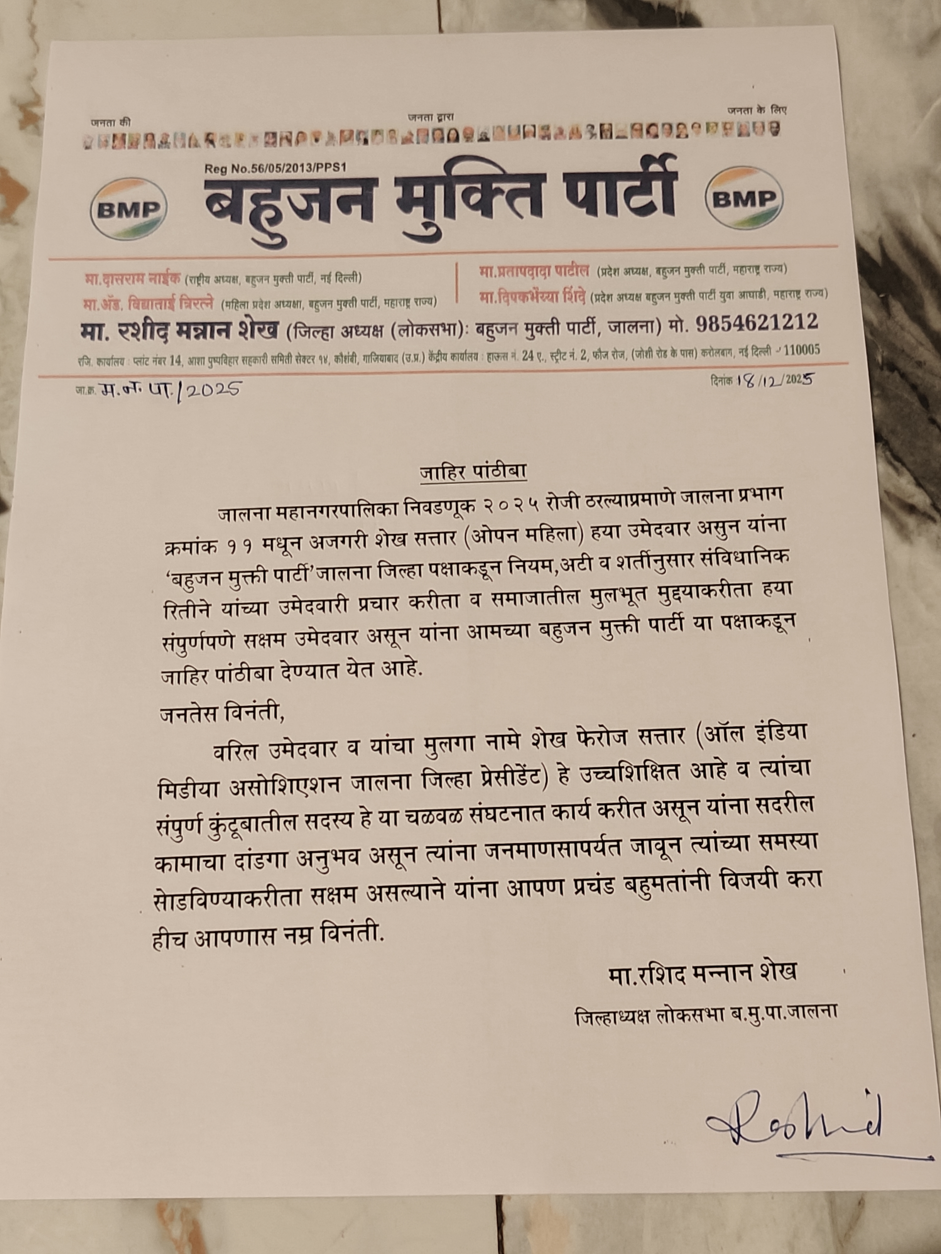 जालना महानगरपालिका निवडणूक २०२५ रोजी ठरल्याप्रमाणे जालना प्रभाग क्रमांक ११ मधून अजगरी शेख सत्तार (ओपन महिला) हया उमेदवार असुन यांना 'बहुजन मुक्ती पार्टी' जालना जिल्हा पक्षाकडून नियम, अटी व शर्तीनुसार संविधानिक रितीने यांच्या उमेदवारी प्रचार करीता व समाजातील मुलभूत मुद्दयाकरीता हया संपुर्णपणे सक्षम उमेदवार असून यांना आमच्या बहुजन मुक्ती पार्टी या पक्षाकडून जाहिर पांठीबा देण्यात येत आहे.