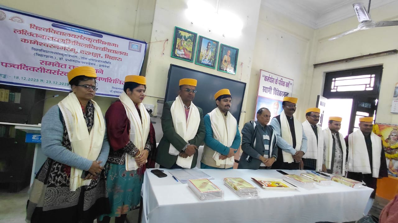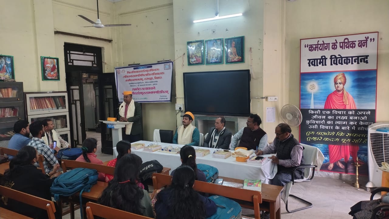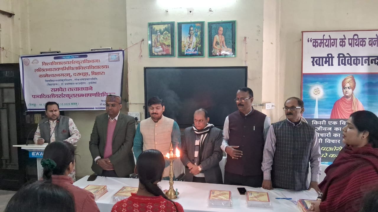 ललित नारायण मिथिला विश्वविद्यालय, दरभंगा के स्नातकोत्तर संस्कृत विभाग, लोकभाषा प्रचार समिति, बिहार प्रान्त एवं डॉ प्रभात दास फाउंडेशन, दरभंगा के संयुक्त तत्त्वावधान में पांच दिवसीय संस्कृत संभाषण शिविर का उद्घाटन सत्र पीजी संस्कृत विभाग में अध्यक्ष डॉ कृष्णकान्त झा की अध्यक्षता में आयोजित की गई, जिसमें सीएमबी कॉलेज, घोघरडीया के प्रधानाचार्य प्रो जीवानन्द झा- उद्धाटक, संस्कृत विश्वविद्यालय के दर्शन-विभागाध्यक्ष डॉ धीरज कुमार पांडेय- मुख्य अतिथि, सीएम कॉलेज, दरभंगा के संस्कृत विभागाध्यक्ष डॉ संजीत कुमार झा- मुख्य वक्ता, विभागीय प्राध्यापिका डॉ ममता स्नेही- स्वागत कर्ता, संस्कृत अध्ययन केन्द्र के अधिकारी डॉ आर एन चौरसिया- धन्यवाद कर्ता एवं शिविर प्रशिक्षक अमित कुमार झा- संचालन कर्ता के साथ ही संस्कृत-प्राध्यापिका डॉ मोना शर्मा एवं शिवम कुमार आदि ने विचार रखें। शिविर में कुमकुम कुमारी ने संस्कृत में स्वागत गीत गाया, जबकि वैदिक मंगलाचरण- डॉ सोमेश्वर नाथ दधीचि तथा पौराणिक मंगलाचरण- शोधार्थी सुधांशु कुमार ने प्रस्तुत किया। इस अवसर पर शोधार्थी- अनिमेष मंडल एवं सोनाली मंडल, छात्र- ईशान, दीपेश कुमार, रीमा कुमारी, जूही कुमारी, रंजना कुमारी, रागनी कुमारी, विमलेश कुमार झा, कृष्णा पासवान, रोशन कुमार तथा दयानंद कुमार आदि ने सक्रिय योगदान किया। कार्यक्रम का उद्घाटन अतिथियों द्वारा दीप प्रज्वलन से हुआ, जबकि अतिथियों का स्वागत पाग एवं चादर से किया गया। इस अवसर पर शिविर प्रशिक्षक अमित कुमार झा ने सहभागियों का प्रारंभिक वर्ग लिया।