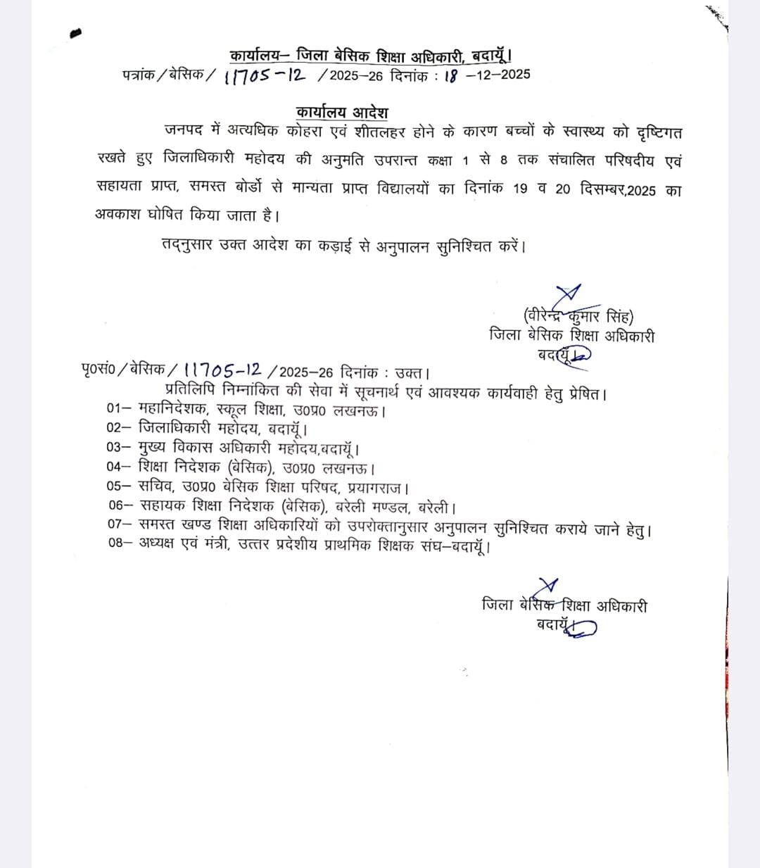 बदायूँ ज़िले के समस्त बोर्ड से मान्यता प्राप्त विद्यालयों में कक्षा 1 से 8 तक का 2 दिन (19 व 20 दिसंबर का) का अवकाश घोषित किया गया.