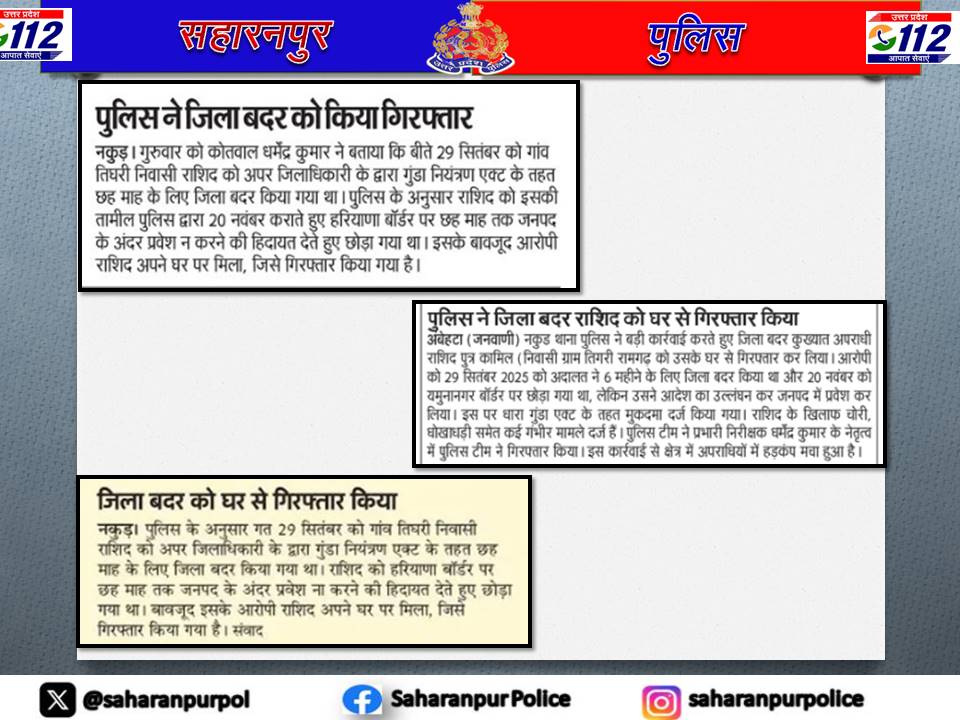 उत्तर प्रदेश के सहारनपुर जनपद की नकुड़ थाना पुलिस ने एक महत्वपूर्ण कार्रवाई करते हुए जिला बदर अपराधी राशिद (पुत्र कामिल) को गिरफ्तार किया है।
