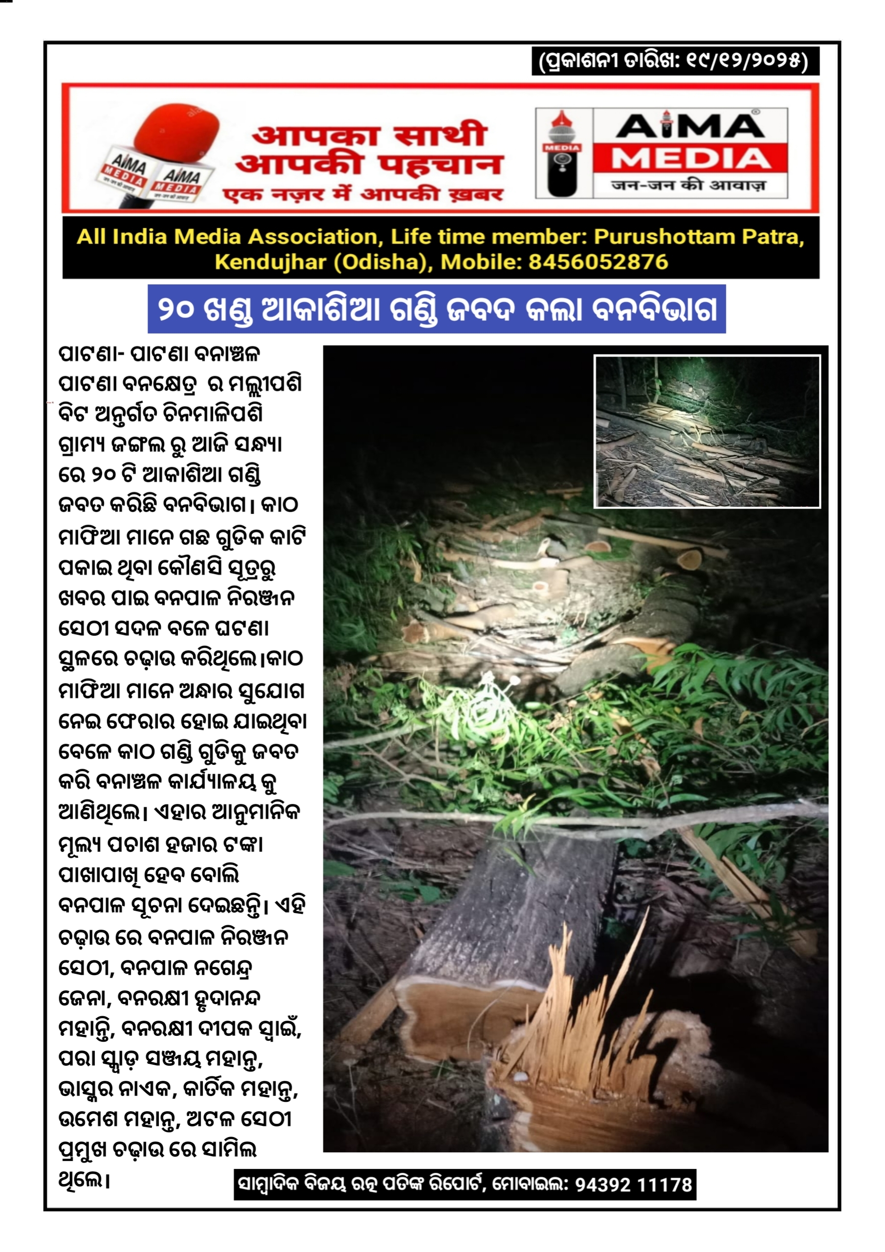 ୨୦ ଖଣ୍ଡ ଆକାଶିଆ ଗଣ୍ଡି ଜବଦ କଲା ବନବିଭାଗ।