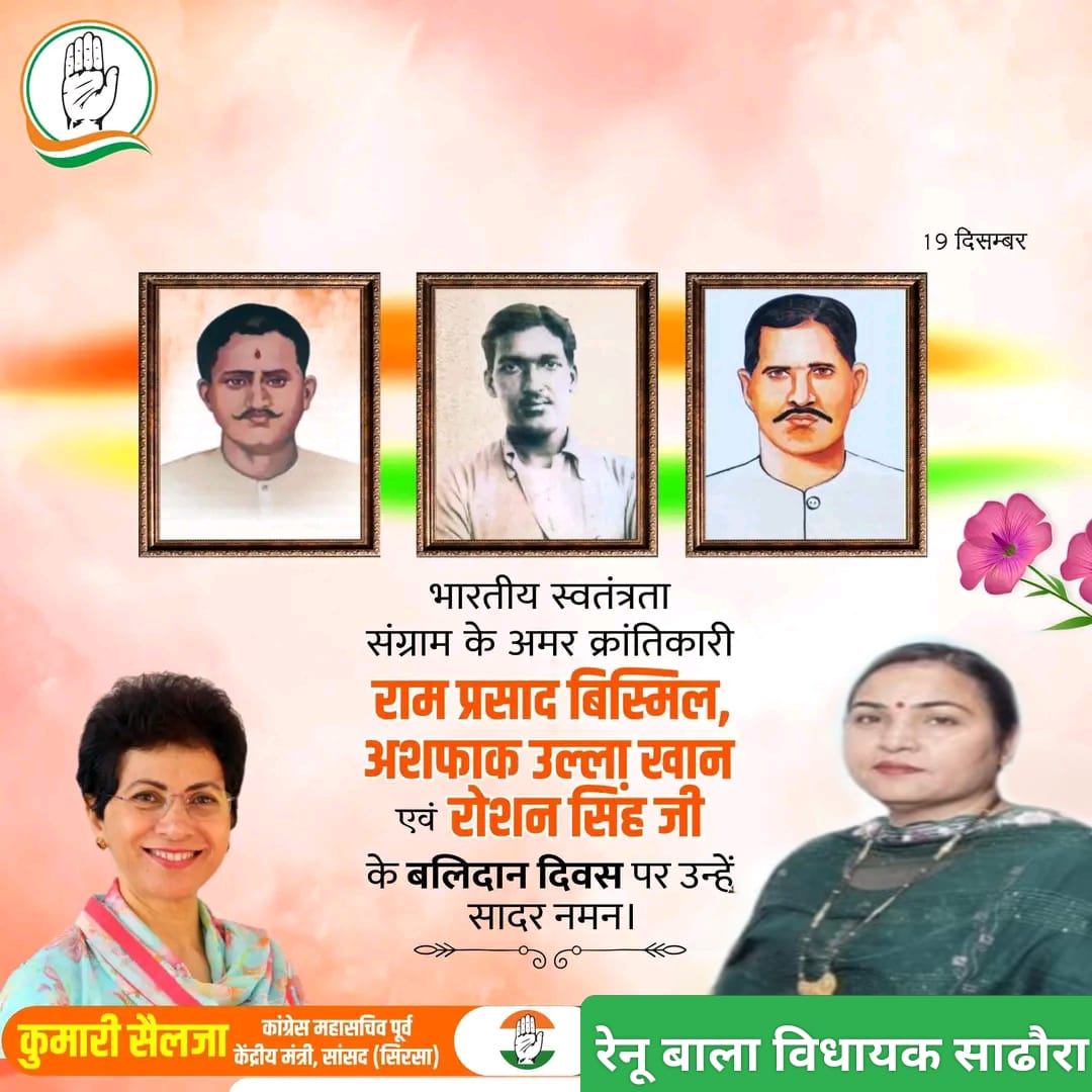 कपुरी :- आज 19 हल्का सधौरा विधायक मैडम रेणु बाला जी नें काकोरी कांड के शहीदों को श्रद्धांजलि इस प्रकार दीं, "काकोरी कांड को अंजाम देने वाले महान स्वतंत्रता सेनानी पं. राम प्रसाद बिस्मिल, अशफाक उल्ला खां और ठाकुर रोशन सिंह जी के बलिदान दिवस पर उन्हें श्रद्धा पूर्वक कोटि कोटि नमन ! विनम्र श्रद्धांजलि" !