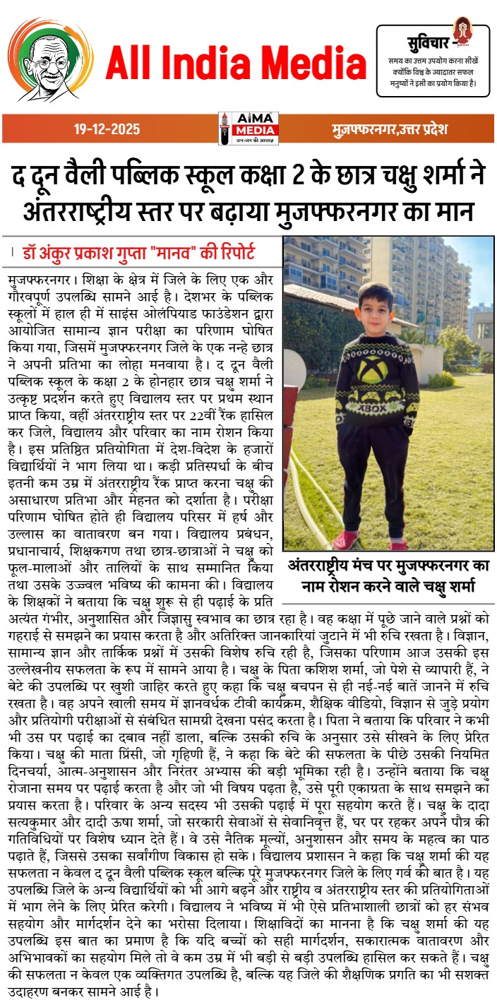द दून वैली पब्लिक स्कूल कक्षा 2 के छात्र चक्षु शर्मा ने अंतरराष्ट्रीय स्तर पर बढ़ाया मुजफ्फरनगर का मान