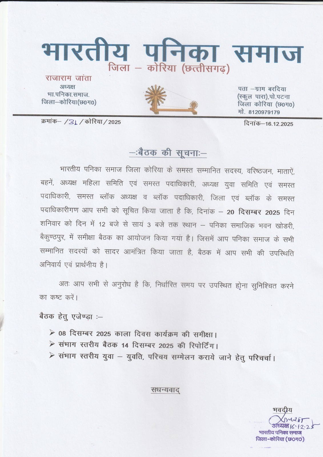 कोरिया/भारतीय पनिका समाज जिला कोरिया छत्तीसगढ़ के समस्त सम्मानित सदस्य,वरिष्ठजन,माताएं बहने,महिला समिति एवं समस्त पदाधिकारी अध्यक्ष युवा समिति एवं समस्त पदाधिकारीगण आप सभी को सूचित किया जाता है कि,दिनांक 20 दिसंबर 2025 दिन शनिवार को 12 बजे से संध्या 3 बजे तक स्थान पनिका सामाजिक भवन खोडरी बैकुंठपुर में समीक्षा बैठक का आयोजन किया गया हैl बैठक में आप सभी की उपस्थिति अनिवार्य एवं प्रार्थनीय हैl