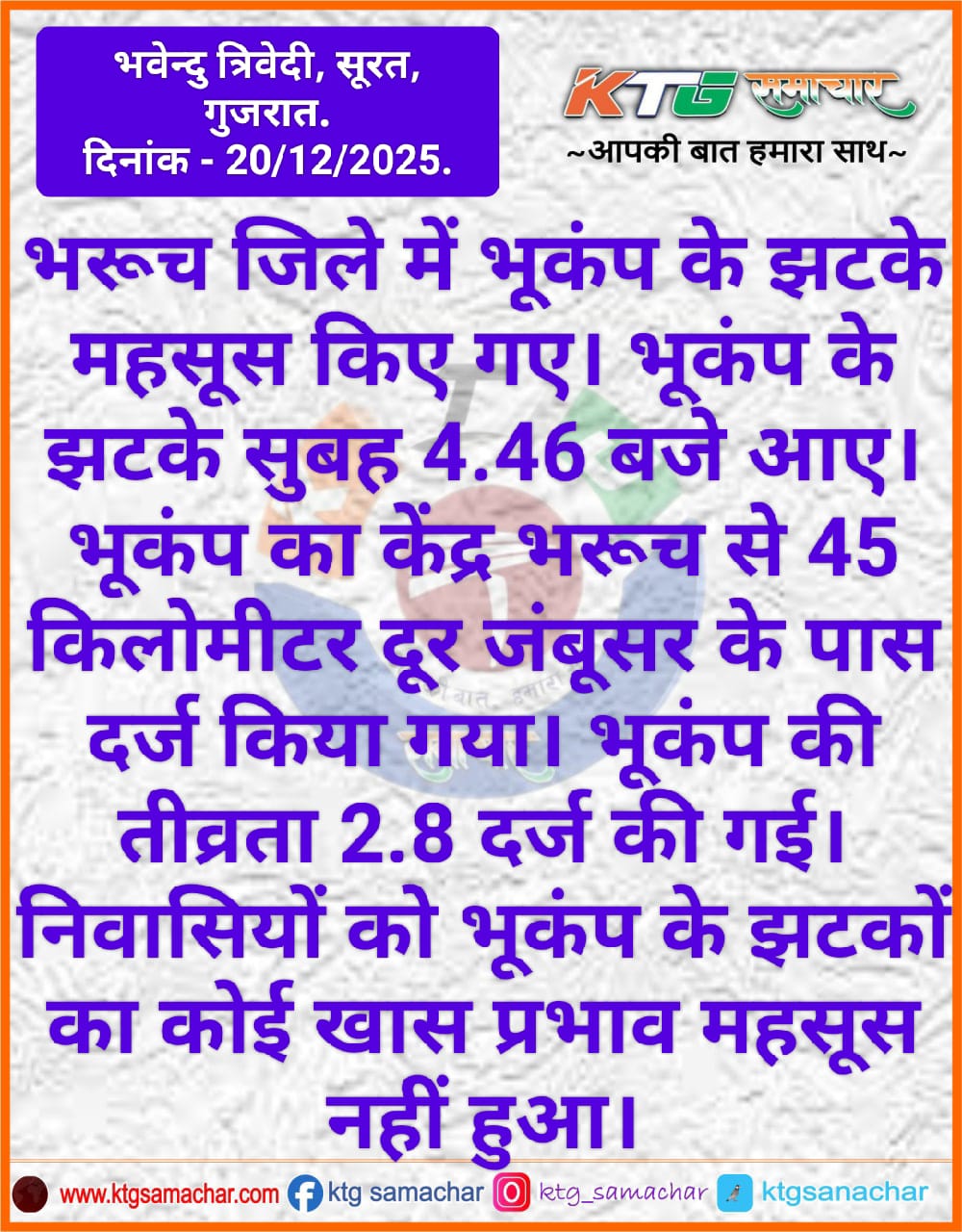 भूकंप का केंद्र भरूच से 45 किलोमीटर दूर जंबूसर के पास दर्ज किया गया।