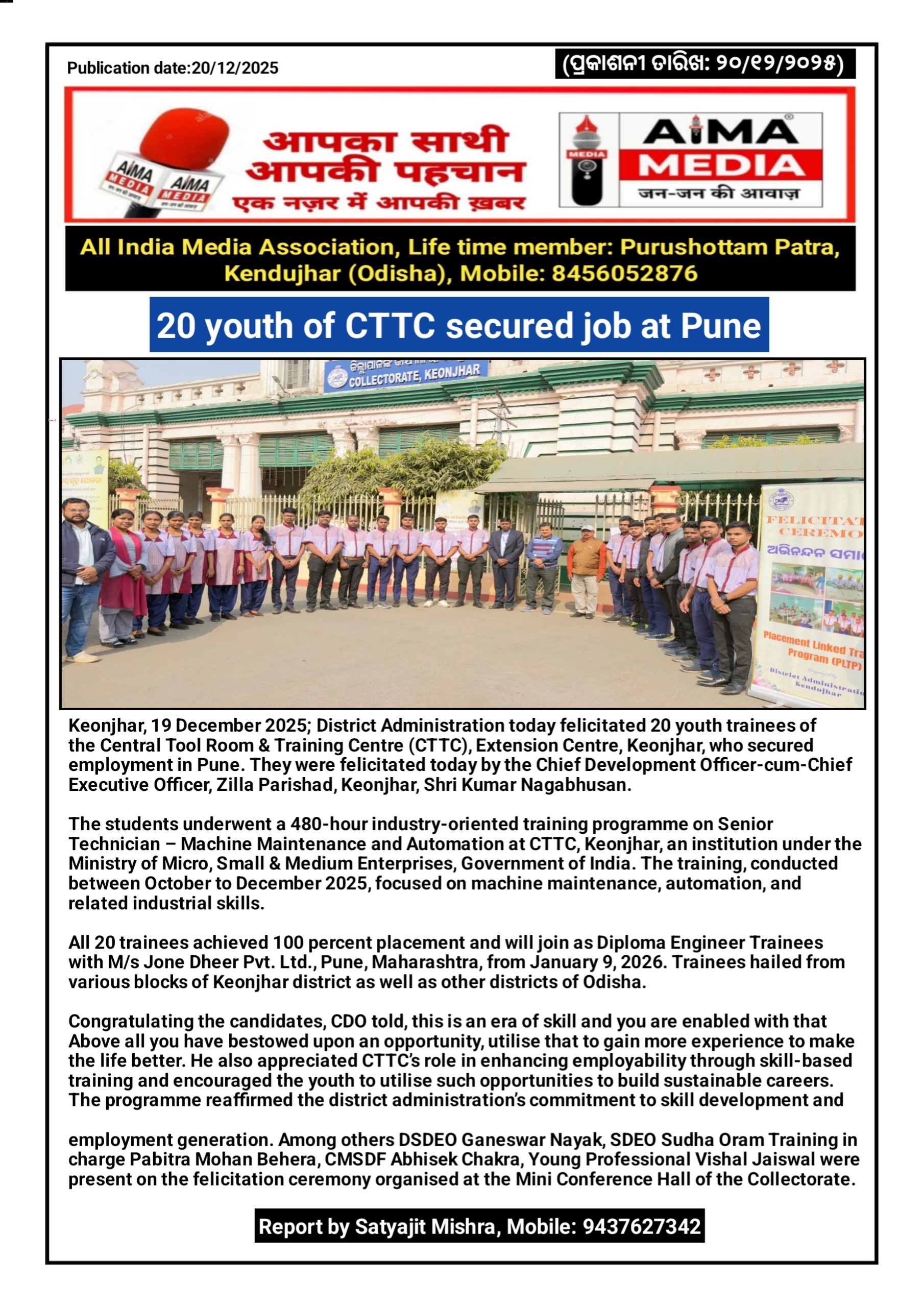 All 20 trainees achieved 100 percent placement and will join as Diploma Engineer Trainees with M/s Jone Dheer Pvt. Ltd., Pune, Maharashtra, from January 9, 2026. Trainees hailed from various blocks of Keonjhar district as well as other districts of Odisha.