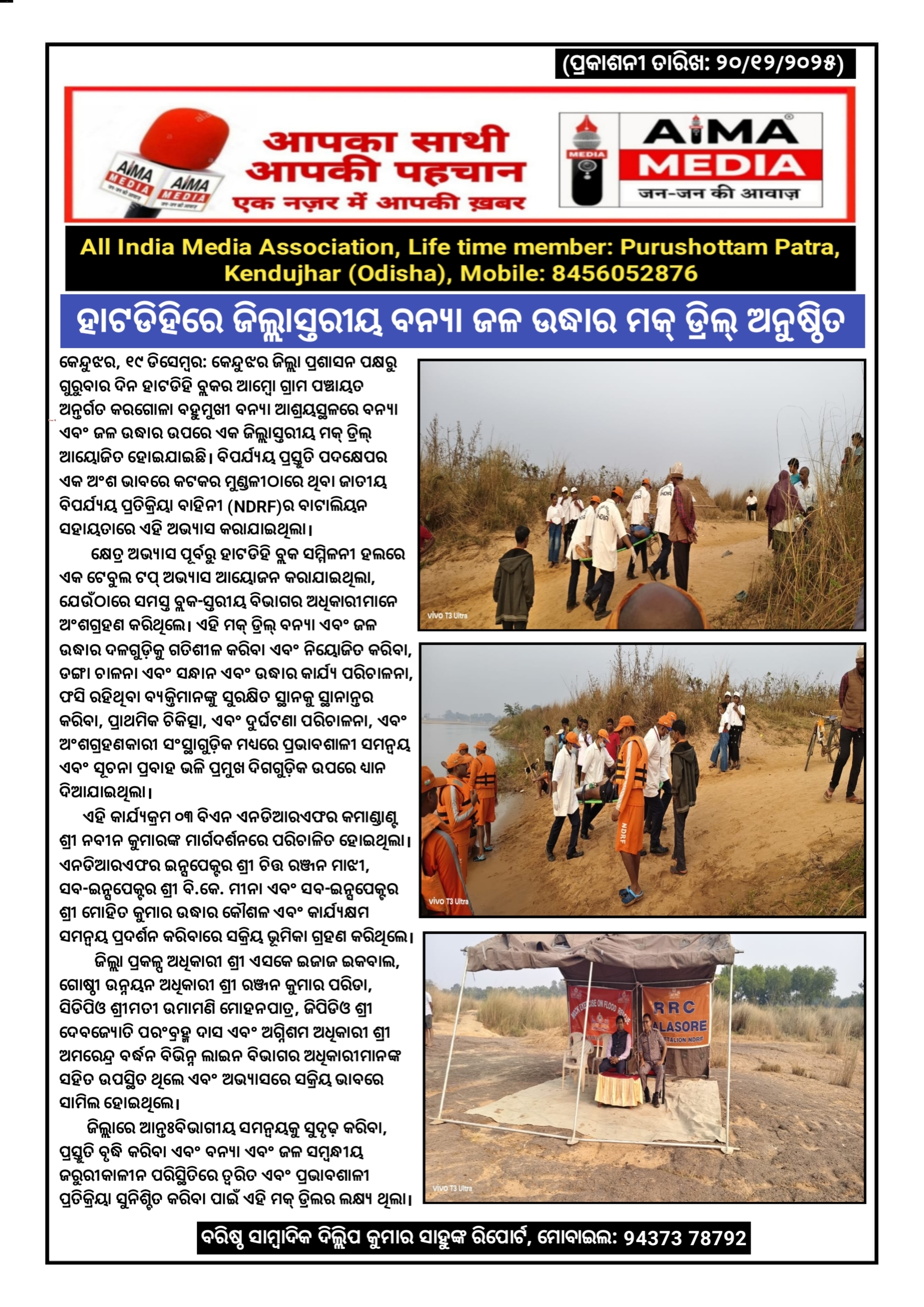 କେନ୍ଦୁଝର, ୧୯ ଡିସେମ୍ବର: କେନ୍ଦୁଝର ଜିଲ୍ଲା ପ୍ରଶାସନ ପକ୍ଷରୁ ଗୁରୁବାର ଦିନ ହାଟଡିହି ବ୍ଲକର ଆମ୍ବୋ ଗ୍ରାମ ପଞ୍ଚାୟତ ଅନ୍ତର୍ଗତ କରଗୋଳା ବହୁମୁଖୀ ବନ୍ୟା ଆଶ୍ରୟସ୍ଥଳରେ ବନ୍ୟା ଏବଂ ଜଳ ଉଦ୍ଧାର ଉପରେ ଏକ ଜିଲ୍ଲାସ୍ତରୀୟ ମକ୍ ଡ୍ରିଲ୍ ଆୟୋଜିତ ହୋଇଯାଇଛି। ବିପର୍ଯ୍ୟୟ ପ୍ରସ୍ତୁତି ପଦକ୍ଷେପର ଏକ ଅଂଶ ଭାବରେ କଟକର ମୁଣ୍ଡଳୀଠାରେ ଥିବା ଜାତୀୟ ବିପର୍ଯ୍ୟୟ ପ୍ରତିକ୍ରିୟା ବାହିନୀ (NDRF)ର ବାଟାଲିୟନ ସହାୟତାରେ ଏହି ଅଭ୍ୟାସ କରାଯାଇଥିଲା।