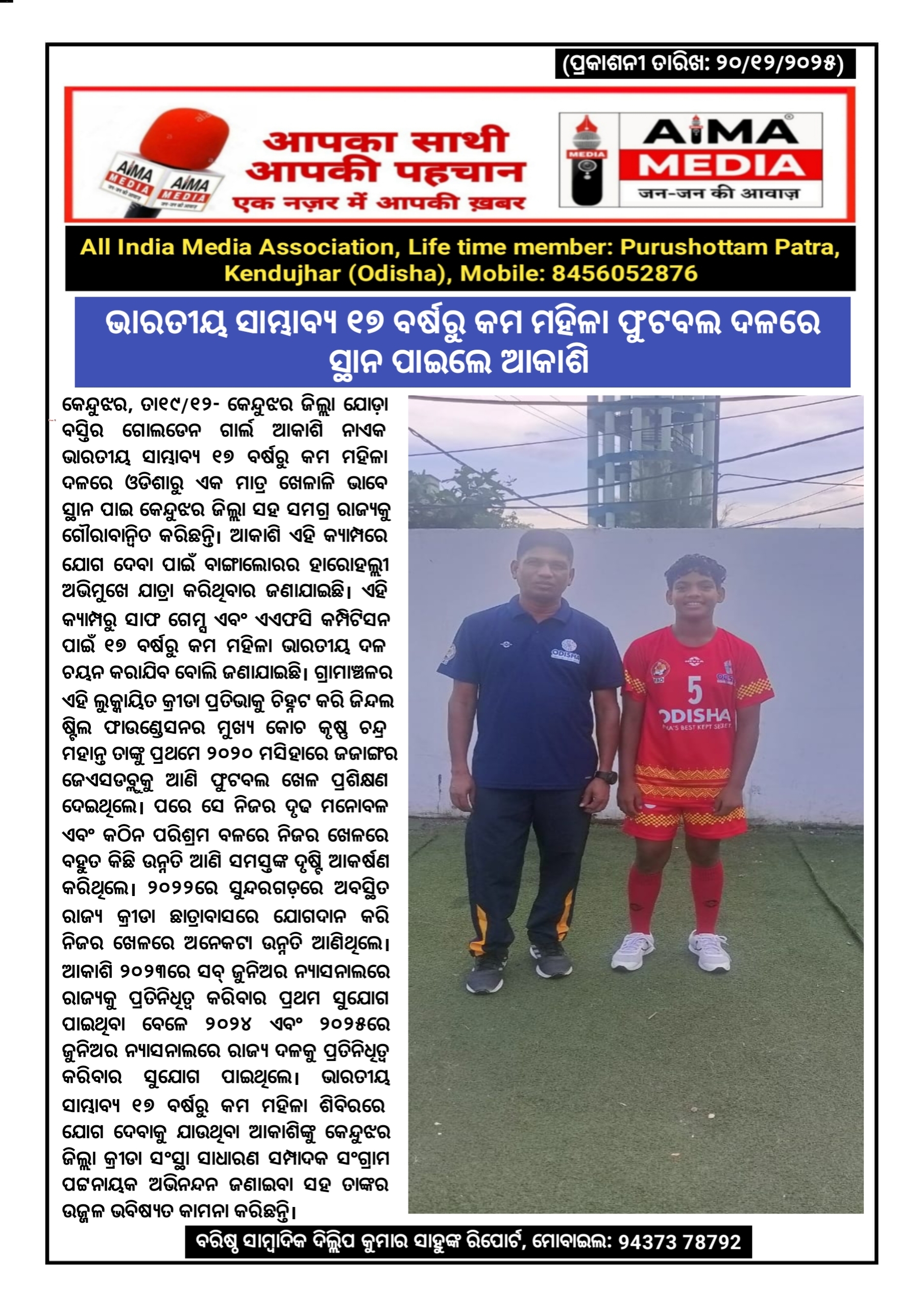 କେନ୍ଦୁଝର,ତା୧୯/୧୨- କେନ୍ଦୁଝର ଜିଲ୍ଲା ଯୋଡ଼ା ବସ୍ତିର ଗୋଲଡେନ ଗାର୍ଲ ଆକାଶି ନାଏକ ଭାରତୀୟ ସାମ୍ଭାବ୍ୟ ୧୭ ବର୍ଷରୁ କମ ମହିଳା ଦଳରେ ଓଡିଶାରୁ ଏକ ମାତ୍ର ଖେଳାଳି ଭାବେ ସ୍ଥାନ ପାଇ କେନ୍ଦୁଝର ଜିଲ୍ଲା ସହ ସମଗ୍ର ରାଜ୍ୟକୁ ଗୌରାବାନ୍ୱିତ କରିଛନ୍ତି l ଆକାଶି ଏହି କ୍ୟାମ୍ପରେ ଯୋଗ ଦେବା ପାଇଁ ବାଙ୍ଗାଲୋରର ହାରୋହଲ୍ଲୀ ଅଭିମୁଖେ ଯାତ୍ରା କରିଥିବାର ଜଣାଯାଇଛି l ଏହି କ୍ୟାମ୍ପରୁ ସାଫ ଗେମ୍ସ ଏବଂ ଏଏଫସି କମ୍ପିଟିସନ ପାଇଁ ୧୭ ବର୍ଷରୁ କମ ମହିଳା ଭାରତୀୟ ଦଳ ଚୟନ କରାଯିବ ବୋଲି ଜଣାଯାଇଛି l ଗ୍ରାମାଞ୍ଚଳର ଏହି ଲୁକ୍କାୟିତ କ୍ରୀଡା ପ୍ରତିଭାକୁ ଚିହ୍ନଟ କରି ଜିନ୍ଦଲ ଷ୍ଟିଲ ଫାଉଣ୍ଡେସନର ମୁଖ୍ୟ କୋଚ କୃଷ୍ଣ ଚନ୍ଦ୍ର ମହାନ୍ତ ତାଙ୍କୁ ପ୍ରଥମେ ୨୦୨୦ ମସିହାରେ ଜଜାଙ୍ଗର ଜେଏସଡବ୍ଲୁକୁ ଆଣି ଫୁଟବଲ ଖେଳ ପ୍ରଶିକ୍ଷଣ ଦେଇଥିଲେ l ପରେ ସେ ନିଜର ଦୃଢ ମନୋବଳ ଏବଂ କଠିନ ପରିଶ୍ରମ ବଳରେ ନିଜର ଖେଳରେ ବହୁତ କିଛି ଉନ୍ନତି ଆଣି ସମସ୍ତଙ୍କ ଦୃଷ୍ଟି ଆକର୍ଷଣ କରିଥିଲେ l ୨୦୨୨ରେ ସୁନ୍ଦରଗଡ଼ରେ ଅବସ୍ଥିତ ରାଜ୍ୟ କ୍ରୀଡା ଛାତ୍ରାବାସରେ ଯୋଗଦାନ କରି ନିଜର ଖେଳରେ ଅନେକଟା ଉନ୍ନତି ଆଣିଥିଲେ। ଆକାଶି ୨୦୨୩ରେ ସବ୍ ଜୁନିଅର ନ୍ୟାସନାଲରେ ରାଜ୍ୟକୁ ପ୍ରତିନିଧିତ୍ୱ କରିବାର ପ୍ରଥମ ସୁଯୋଗ ପାଇଥିବା ବେଳେ ୨୦୨୪ ଏବଂ ୨୦୨୫ରେ ଜୁନିଅର ନ୍ୟାସନାଲରେ ରାଜ୍ୟ ଦଳକୁ ପ୍ରତିନିଧିତ୍ୱ କରିବାର ସୁଯୋଗ ପାଇଥିଲେ। ଭାରତୀୟ ସାମ୍ଭାବ୍ୟ ୧୭ ବର୍ଷରୁ କମ ମହିଳା ଶିବିରରେ ଯୋଗ ଦେବାକୁ ଯାଉଥିବା ଆକାଶିଙ୍କୁ କେନ୍ଦୁଝର ଜିଲ୍ଲା କ୍ରୀଡା ସଂସ୍ଥା ସାଧାରଣ ସମ୍ପାଦକ ସଂଗ୍ରାମ ପଟ୍ଟନାୟକ ଅଭିନନ୍ଦନ ଜଣାଇବା ସହ ତାଙ୍କର ଉଜ୍ଜଳ ଭବିଷ୍ୟତ କାମନା କରିଛନ୍ତି l
