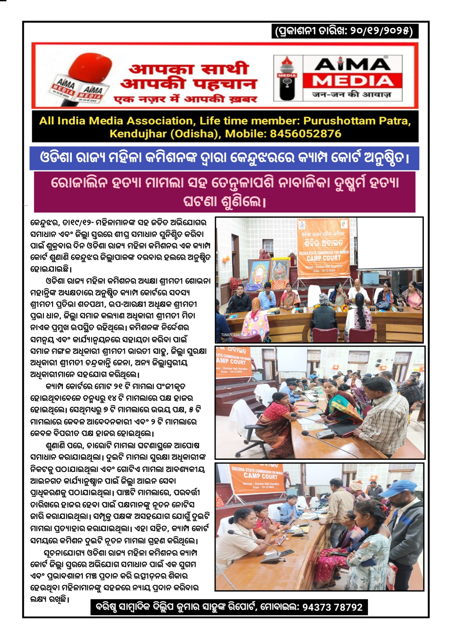 ଓଡିଶା ରାଜ୍ୟ ମହିଳା କମିଶନଙ୍କ ଦ୍ୱାରା କେନ୍ଦୁଝରରେ କ୍ୟାମ୍ପ କୋର୍ଟ ଅନୁଷ୍ଠିତ। ରୋଜାଲିନ ହତ୍ୟା ମାମଲା ସହ ତେନ୍ତଳାପଶି ନାବାଳିକା ଦୁଷ୍କର୍ମ ହତ୍ୟା ଘଟଣା ଶୁଣିଲେ।