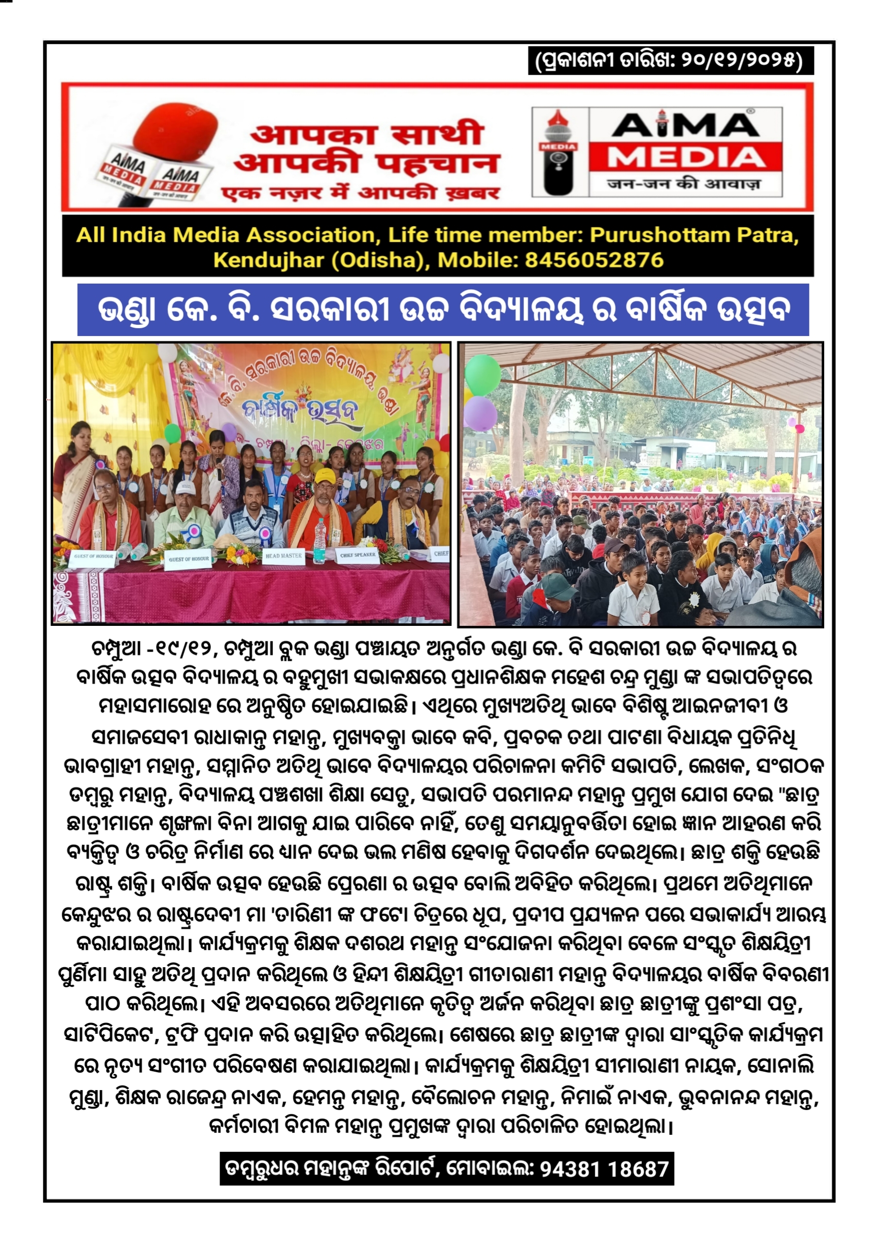 ଚମ୍ପୁଆ -19/12,ଚମ୍ପୁଆ ବ୍ଲକ ଭଣ୍ଡା ପଞ୍ଚାୟତ ଅନ୍ତର୍ଗତ ଭଣ୍ଡା କେ. ବି ସରକାରୀ ଉଚ୍ଚ ବିଦ୍ୟାଳୟ ର ବାର୍ଷିକ ଉତ୍ସବ ବିଦ୍ୟାଳୟ ର ବହୁମୁଖୀ ସଭାକକ୍ଷରେ ପ୍ରଧାନଶିକ୍ଷକ ମହେଶ ଚନ୍ଦ୍ର ମୁଣ୍ଡା ଙ୍କ ସଭାପତିତ୍ୱରେ ମହାସମାରୋହ ରେ ଅନୁଷ୍ଠିତ ହୋଇଯାଇଛି l ଏଥିରେ ମୁଖ୍ୟଅତିଥି ଭାବେ ବିଶିଷ୍ଟ ଆଇନଜୀବୀ ଓ ସମାଜସେବୀ ରାଧାକାନ୍ତ ମହାନ୍ତ, ମୁଖ୍ୟବକ୍ତା ଭାବେ କବି, ପ୍ରବଚକ ତଥା ପାଟଣା ବିଧାୟକ ପ୍ରତିନିଧି ଭାବଗ୍ରାହୀ ମହାନ୍ତ, ସମ୍ମାନିତ ଅତିଥି ଭାବେ ବିଦ୍ୟାଳୟର ପରିଚାଳନା କମିଟି ସଭାପତି, ଲେଖକ, ସଂଗଠକ ଡମ୍ବରୁ ମହାନ୍ତ, ବିଦ୍ୟାଳୟ ପଞ୍ଚଶଖା ଶିକ୍ଷା ସେତୁ, ସଭାପତି ପରମାନନ୍ଦ ମହାନ୍ତ ପ୍ରମୁଖ ଯୋଗ ଦେଇ "ଛାତ୍ର ଛାତ୍ରୀମାନେ ଶୃଙ୍ଖଳା ବିନା ଆଗକୁ ଯାଇ ପାରିବେ ନାହିଁ, ତେଣୁ ସମୟାନୁବର୍ତ୍ତିତା ହୋଇ ଜ୍ଞାନ ଆହରଣ କରି ବ୍ୟକ୍ତିତ୍ୱ ଓ ଚରିତ୍ର ନିର୍ମାଣ ରେ ଧ୍ୟାନ ଦେଇ ଭଲ ମଣିଷ ହେବାକୁ ଦିଗଦର୍ଶନ ଦେଇଥିଲେ l ଛାତ୍ର ଶକ୍ତି ହେଉଛି ରାଷ୍ଟ୍ର ଶକ୍ତି l ବାର୍ଷିକ ଉତ୍ସବ ହେଉଛି ପ୍ରେରଣା ର ଉତ୍ସବ ବୋଲି ଅବିହିତ କରିଥିଲେ l ପ୍ରଥମେ ଅତିଥିମାନେ କେନ୍ଦୁଝର ର ରାଷ୍ଟ୍ରଦେବୀ ମା 'ତାରିଣୀ ଙ୍କ ଫଟୋ ଚିତ୍ରରେ ଧୂପ, ପ୍ରଦୀପ ପ୍ରଯ୍ୟଳନ ପରେ ସଭାକାର୍ଯ୍ୟ ଆରମ୍ଭ କରାଯାଇଥିଲା l କାର୍ଯ୍ୟକ୍ରମକୁ ଶିକ୍ଷକ ଦଶରଥ ମହାନ୍ତ ସଂଯୋଜନା କରିଥିବା ବେଳେ ସଂସ୍କୃତ ଶିକ୍ଷୟିତ୍ରୀ ପୁର୍ଣିମା ସାହୁ ଅତିଥି ପ୍ରଦାନ କରିଥିଲେ ଓ ହିନ୍ଦୀ ଶିକ୍ଷୟିତ୍ରୀ ଗୀତାରାଣୀ ମହାନ୍ତ ବିଦ୍ୟାଳୟର ବାର୍ଷିକ ବିବରଣୀ ପାଠ କରିଥିଲେ l ଏହି ଅବସରରେ ଅତିଥିମାନେ କୃତିତ୍ୱ ଅର୍ଜନ କରିଥିବା ଛାତ୍ର ଛାତ୍ରୀଙ୍କୁ ପ୍ରଶଂସା ପତ୍ର, ସାଟିପିକେଟ, ଟ୍ରଫି ପ୍ରଦାନ କରି ଉତ୍ସlହିତ
